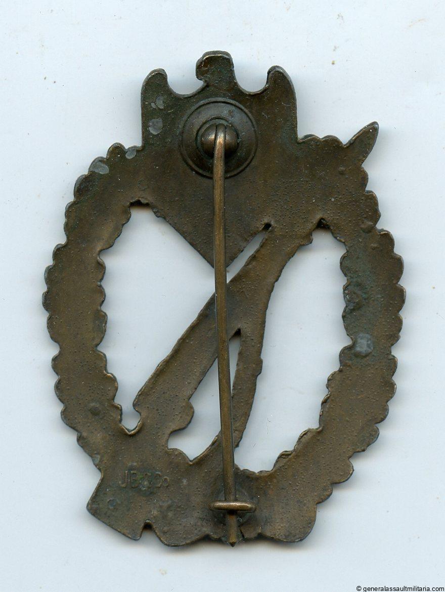 Infantry assault badge in bronze – Josef Bergs & Co, Gablonz. Mid to late war solid zinc IAB with JB&Co makers mark on the bottom left. Remains in lightly worn condition with some flakes of finish missing and the zinc base material exposed in these spots. Overall excellent preserved with a good chocolate color two tone finish. Difficult to find IAB in bronze with makers mark and one of the best and most detailed IAB designs.