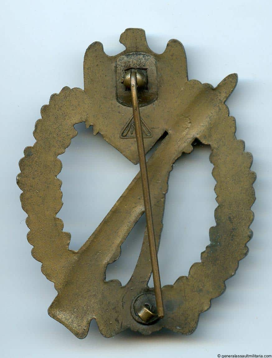 Infantry assault badge in bronze – Metall & Kunststoff in triangle. Mid to late war zinc IAB with crimped in setup and bronze. Remains in unworn condition and has all the bronze finish still present. Catch and hinge are nicely crimped, maker marked on the back the MK in triangle logo and has a slightly bent down catch.