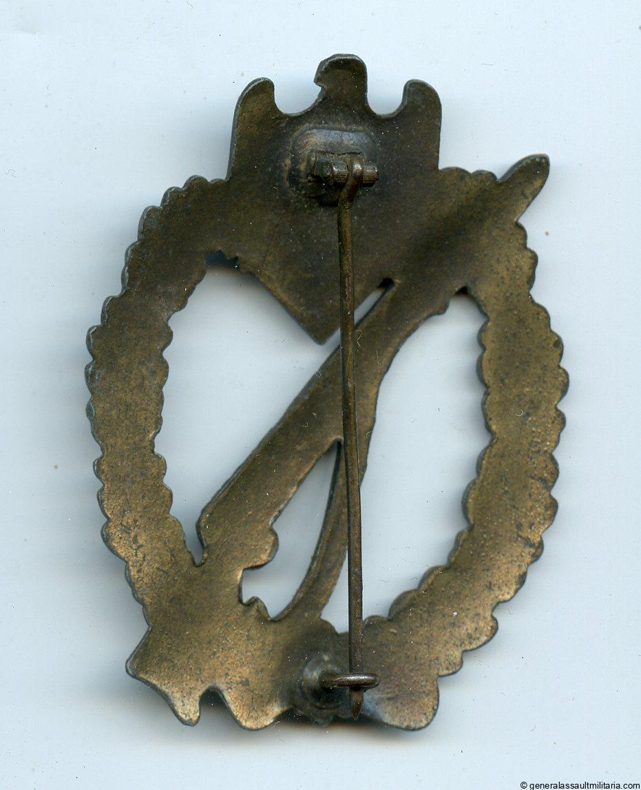 Infantry assault badge in bronze – Rudolf Karneth, Gablonz. Mid to late war bronze IAB with RK design and two tone bronze finish. Remains in very good, very lightly worn condition with the crimped setup nicely intact and still tight. Good looking bronze variant.