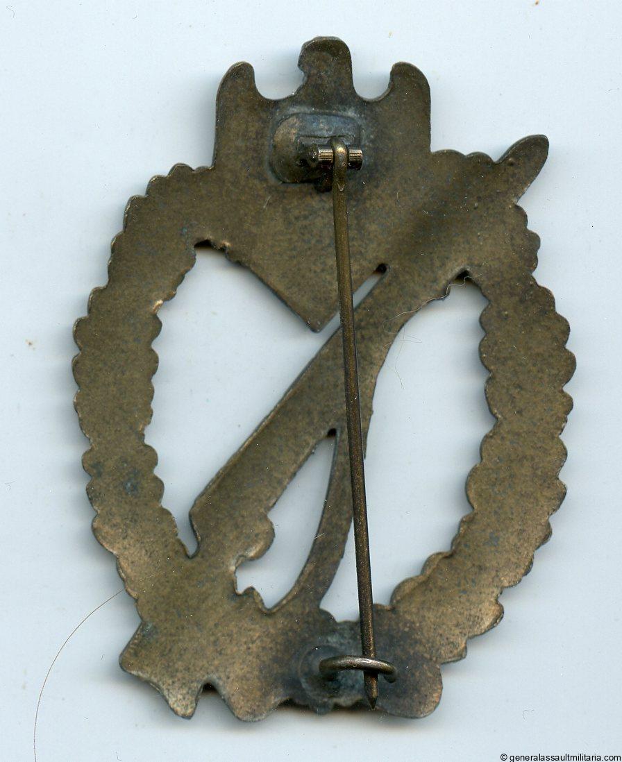 Infantry assault badge in bronze – Rudolf karneth, Gablonz. Zinc IAB with crimped catch and hinge and bright bronze two tone finish. Remains in mint unworn condition and has kept the bronze finish well. Good looking bronze IAB in unupgradable condition.