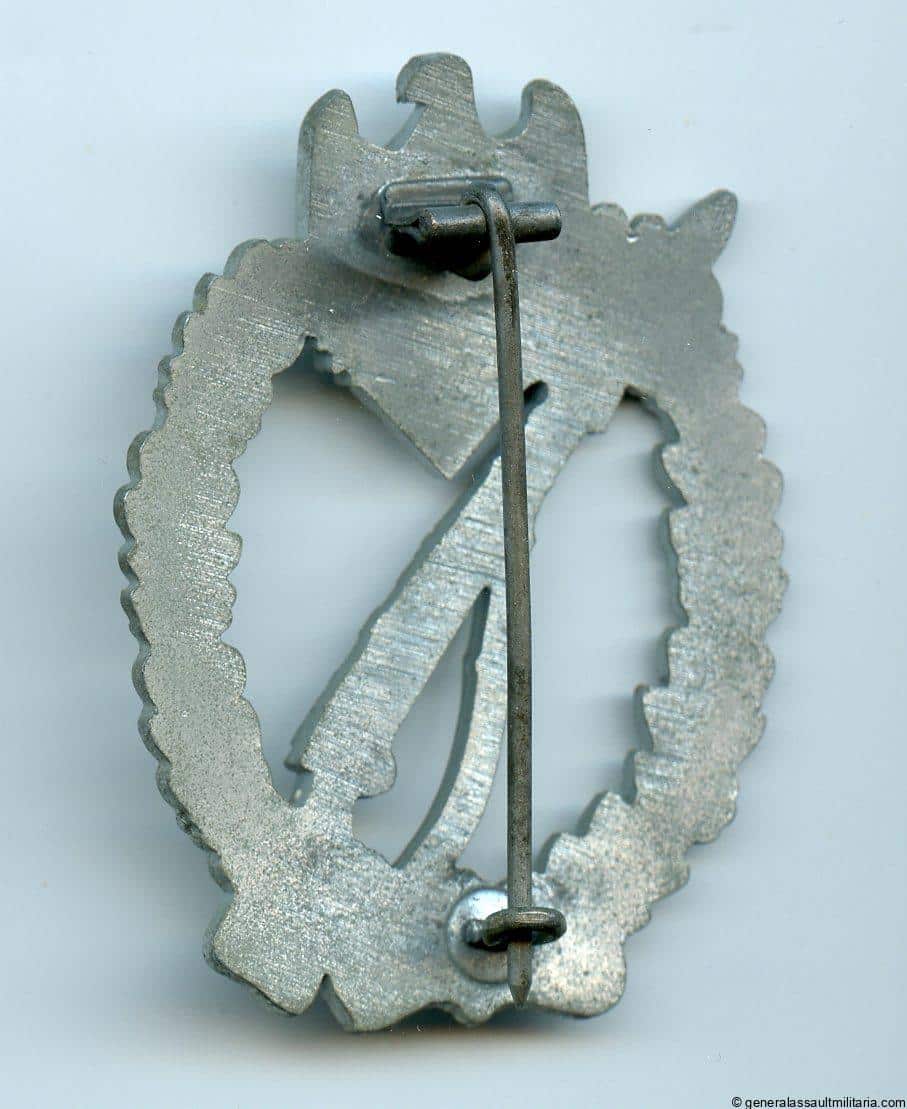 Infantry assault badge in silver – Alois Rettenmaier, Schwäbisch Gmünd. Mid to late war solid zinc ‘Infanterie-Sturmabzeichen’ with ‘Glanzverzinkt’ finish and Rettenmaier design. Remains in mint condition with full finish showing. Excellent mint example!