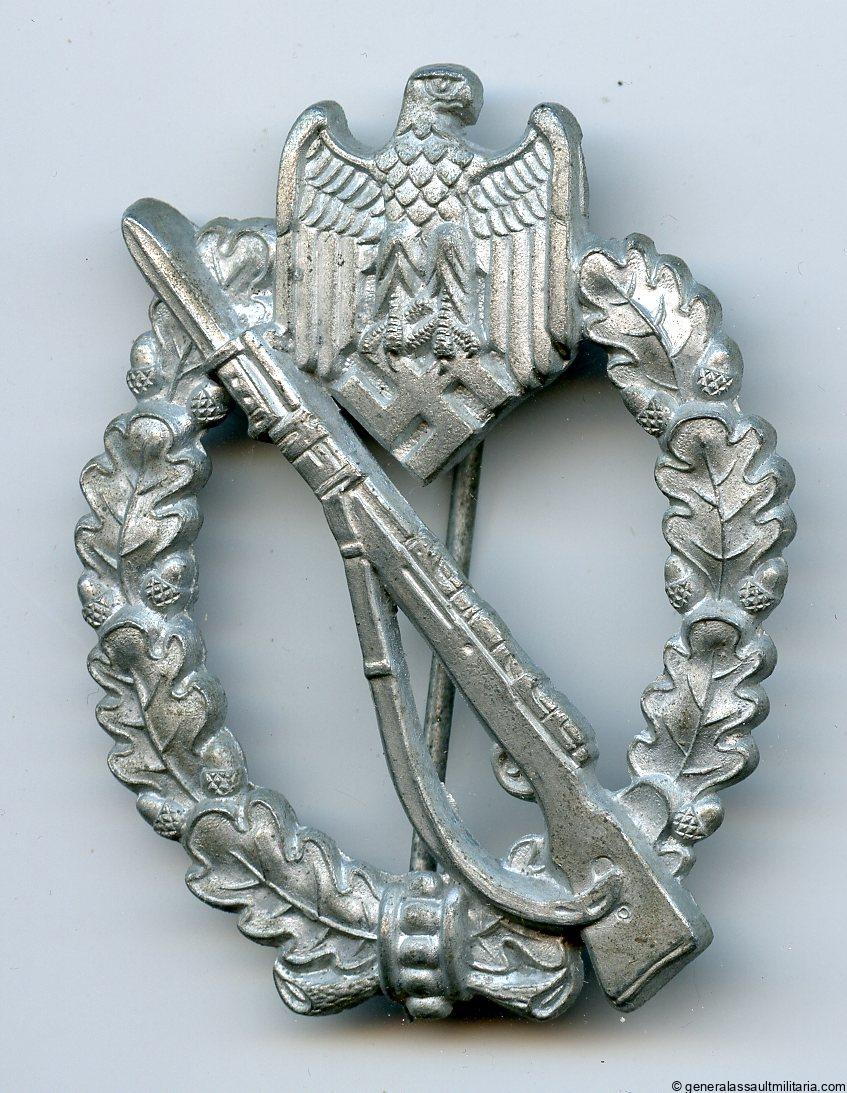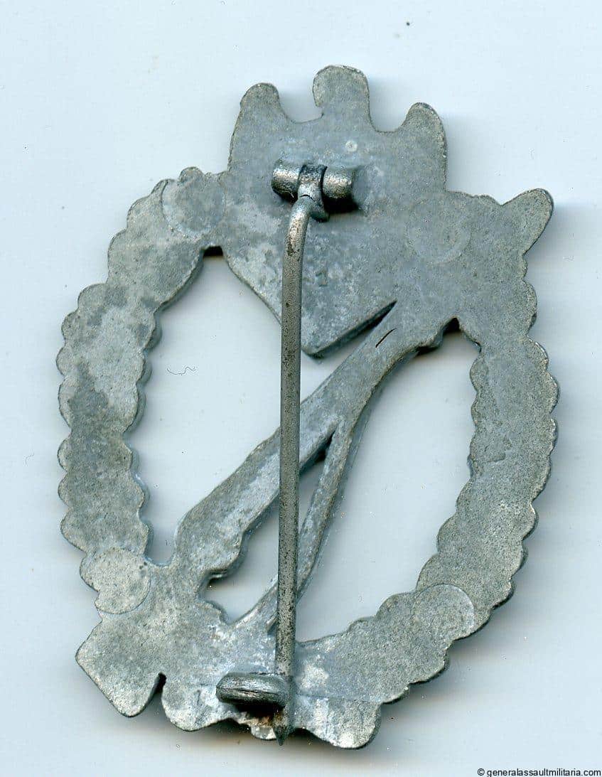 Infantry assault badge in silver – Assmann & Söhne, Lüdenscheid. Solid zinc injection mold die ‘1’ Assmann with integral setup. Remains in unworn condition with all the silver still present. Very well preserved condition with the die number 1 on the reverse and the soldered on hinge variant setup.