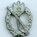 Infantry assault badge in silver – Assmann & Söhne, Lüdenscheid. Late war injection mold die 2 zinc IAB by Assmann. Remains in lightly worn condition with most of the silver finish still present. Very attractive IAB with integral catch and hinge. The needle is a bit bend downwards but is still perfectly attached to the hinge pin.