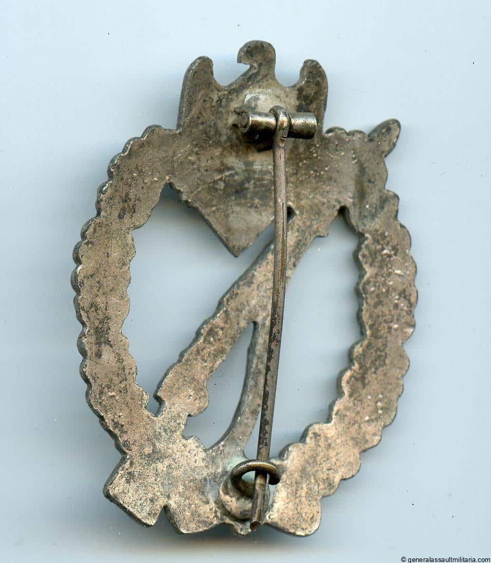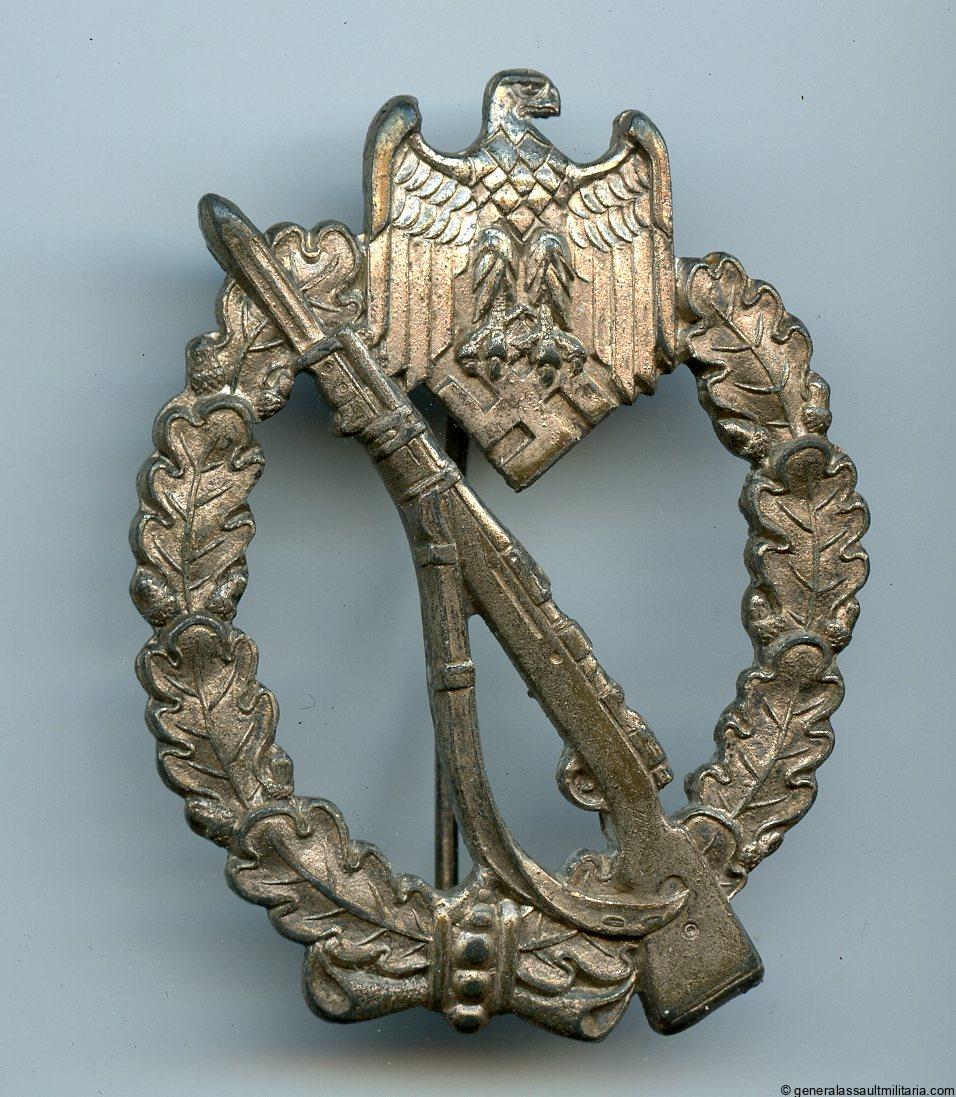 Infantry assault badge in silver – C.E. Juncker, Berlin. Mid to late war solid zinc Juncker with round wire catch and copper/tombac plated surface. Remains in excellent, lightly worn condition with nearly all the finish and plating preserved. Very good quality zink IAB.