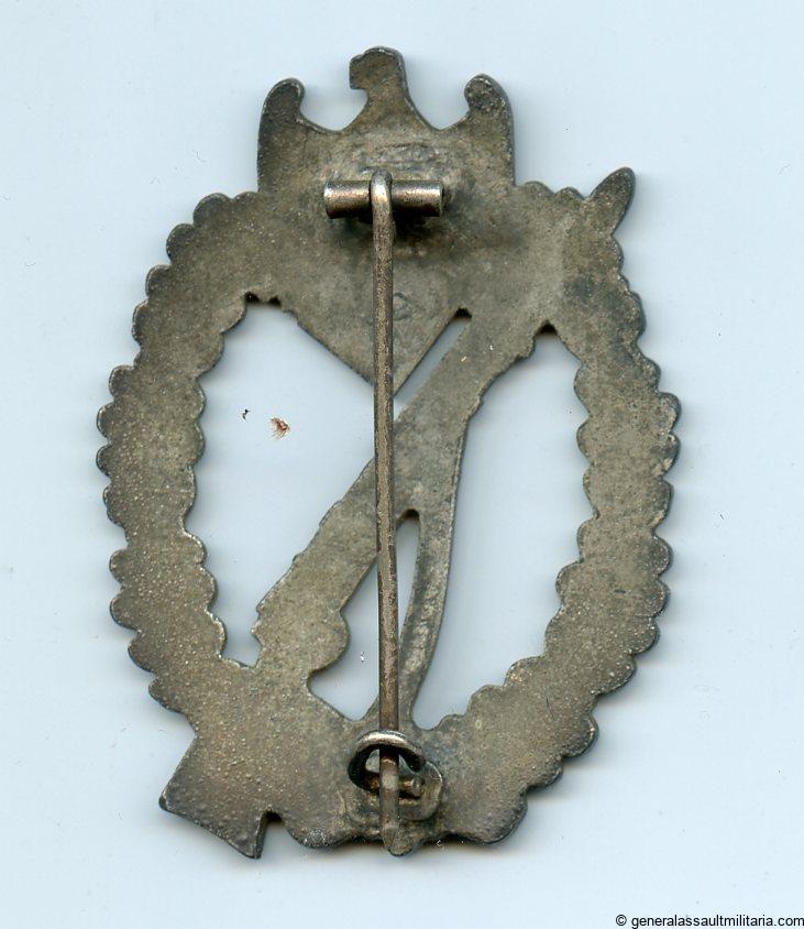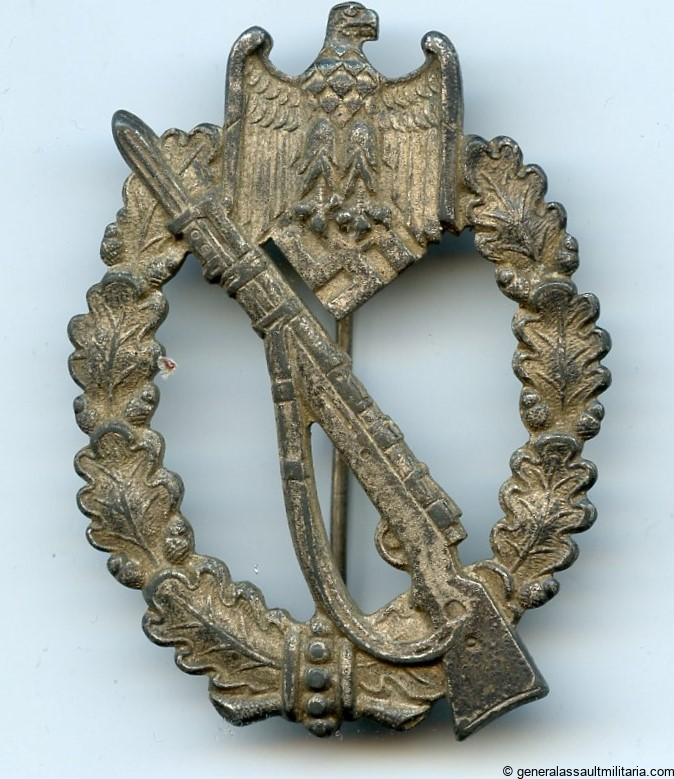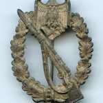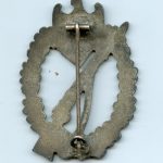 Infantry assault badge in silver – Carl Wild, Hamburg. Zinc IAB in well worn condition and most of the finish remaining. Nicely marked CW on the back as is always the case with Carl Wild ‘Infanterie Sturmabzeichen’. No damage or repairs, slightly more uncommon maker with variant finish.