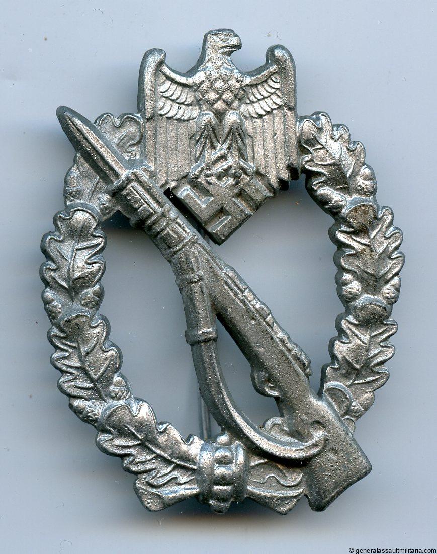 Infantry assault badge in silver – E.F. Wiedmann, Frankfurt. Mid to late war solid zinc example with Wiedmann logo mark on the reverse. Remains in unworn and near mint condition, shows all the finish remaining with a very bright appearance. Good quality example with the ‘lilypad’ hinge setup.