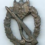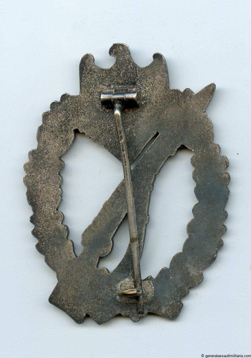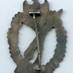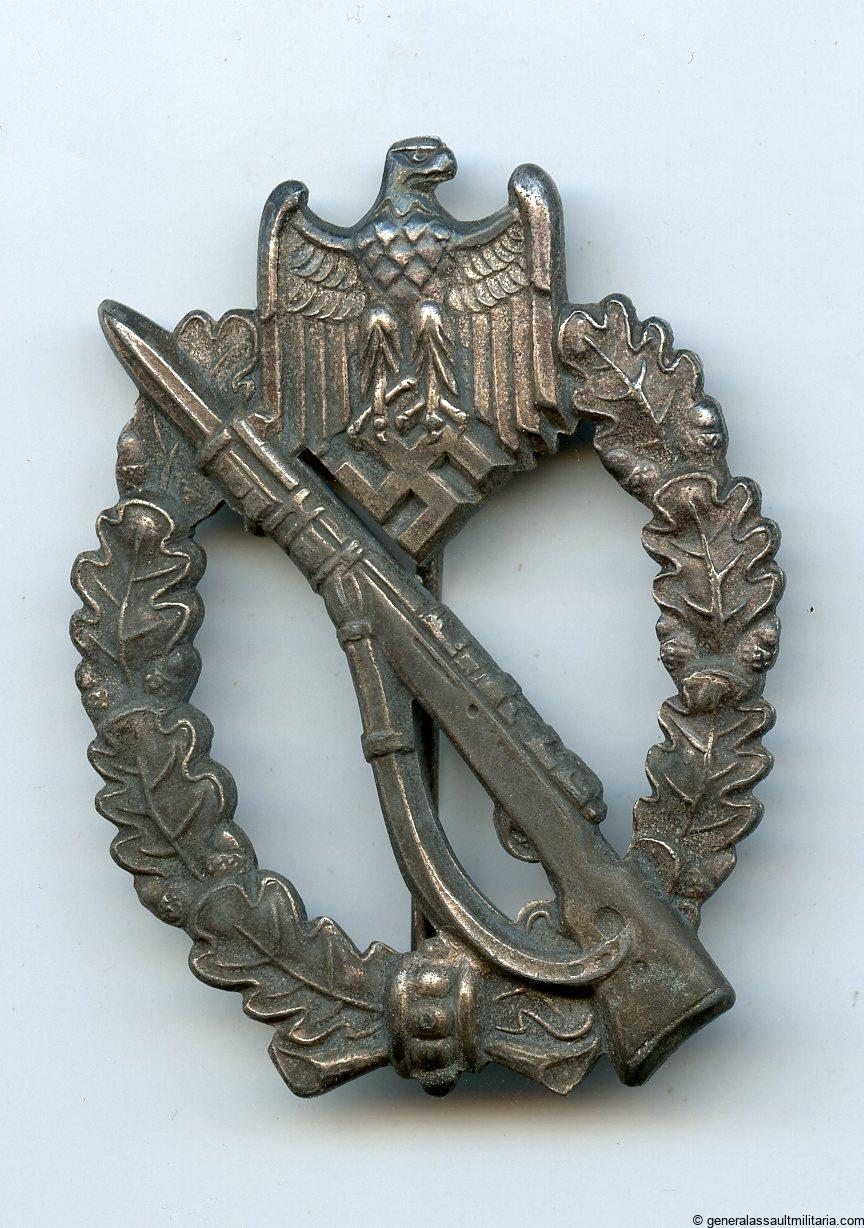 Infantry assault badge in silver – E.F. Wiedmann, Frankfurt. Zinc Wiedmann design IAB with variant setup. Nicely worn condition with a good amount of the finish still present. One of many Uncommon setup variants produced by Wiedmann.