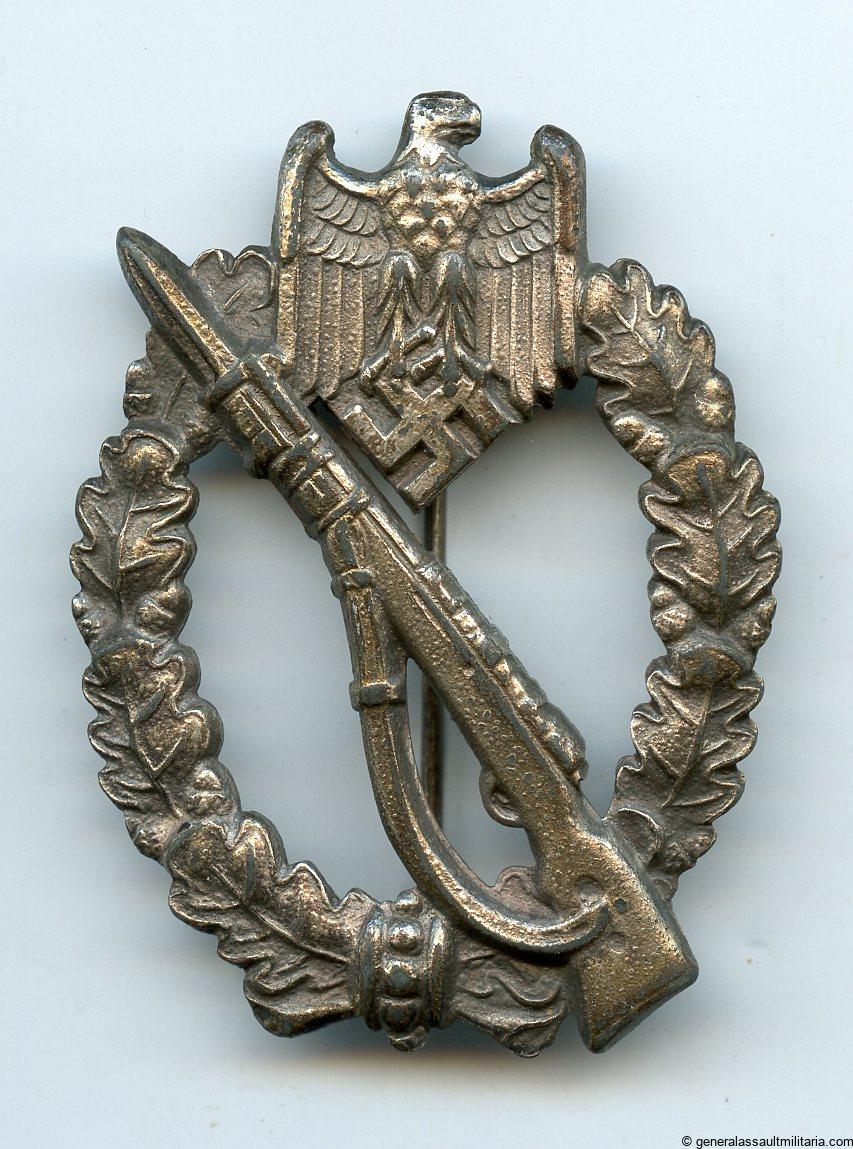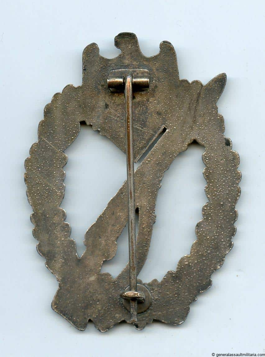 Infantry assault badge in silver – E.F. Wiedmann, Frankfurt. Zinc IAB with Wiedmann design and thick silver plated finish with copper coating underneath. Remains in worn condition and shows most of the finish still remaining on the badge. Only a slight brownish patina on this very well preserved Wiedmann.