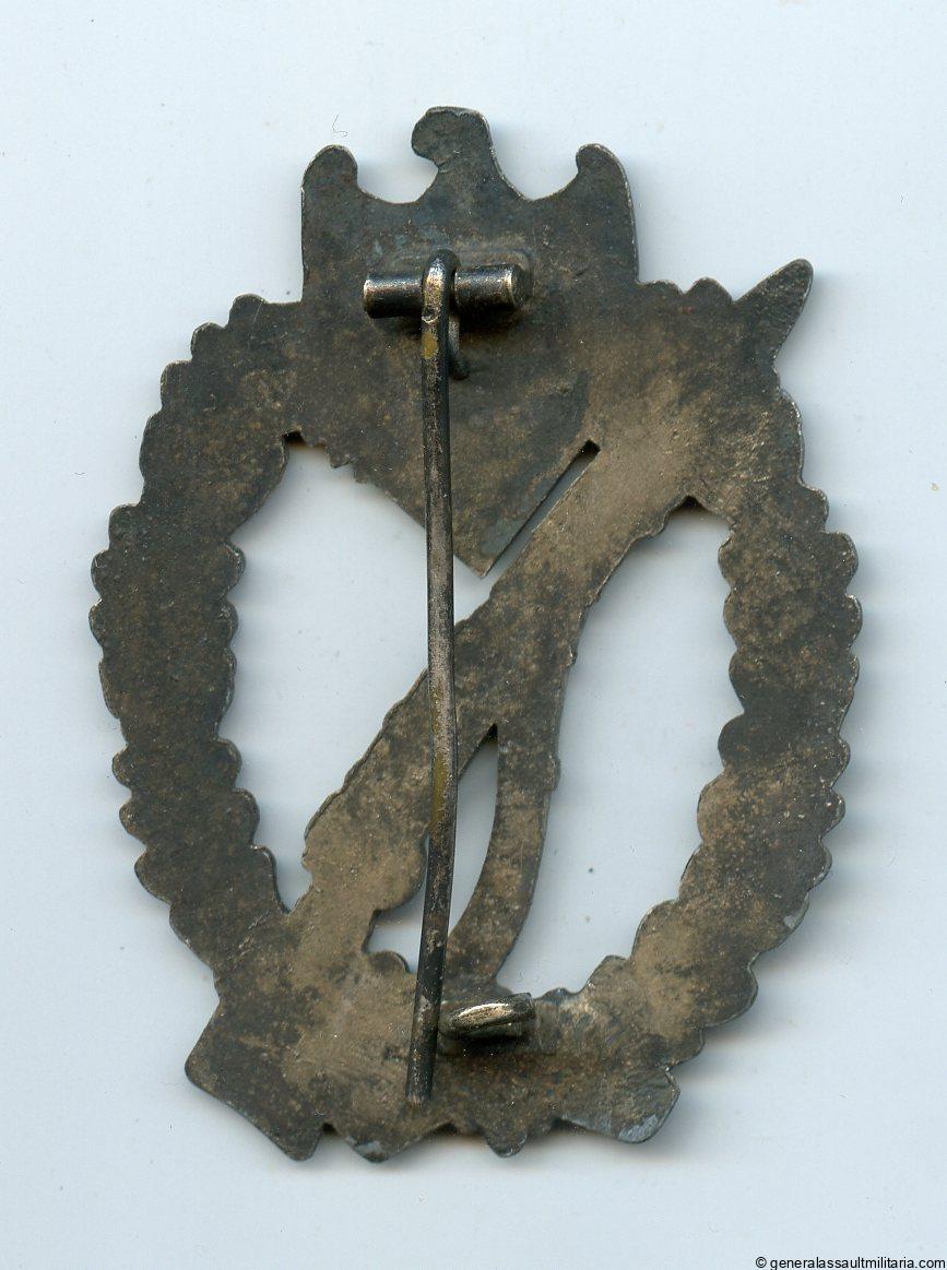 Infantry assault badge in silver – E.F. Wiedmann, Frankfurt. Zinc IAB with Wiedmann design and thick silver plated finish with copper coating underneath. Remains in worn condition and shows most of the finish still remaining on the badge. Only a slight brownish patina on this very well preserved Wiedmann.