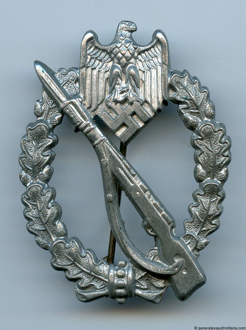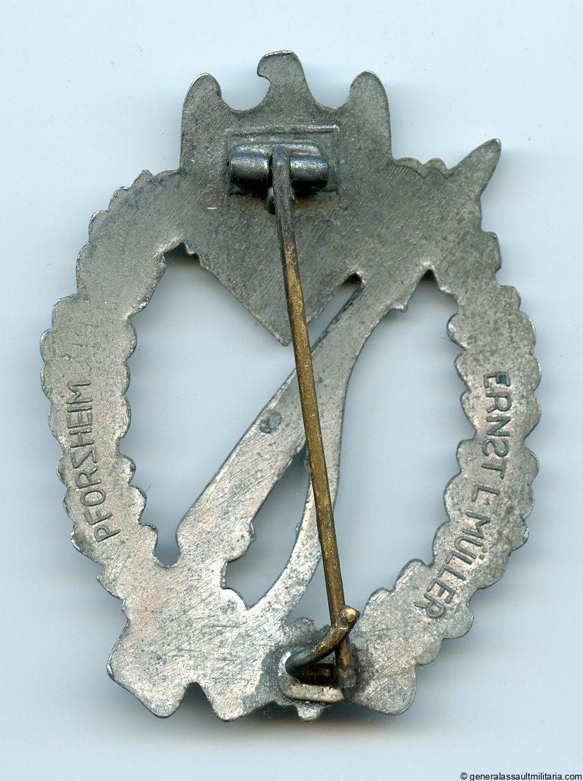 Infantry assault badge in silver – E. Müller, Pforzheim. Solid zinc ‘Infanterie Sturmabzeichen’ with ‘Glanzverzinkt’ finish and full maker mark on the reverse. Remains in lightly worn condition with most of the silver finish still present. The catch is slightly bend upwards but still closes nicely. The IAB with the largest maker mark and a unique design. More difficult example to find with the makers mark.