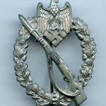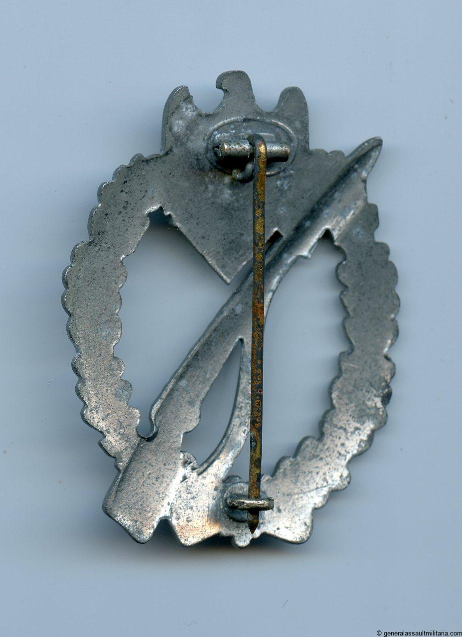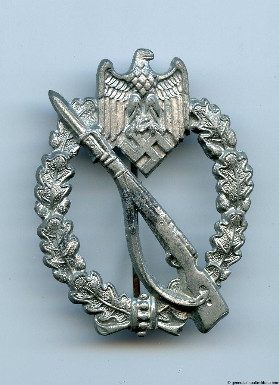 Infantry assault badge in silver – E. Müller, Pforzheim. Semi hollow zinc IAB with E. Müller design and silver finish(Glanzverzinkt). Remains in worn condition with most of the silver finish still present and a bright appearance. Shows slightly more finish loss on the middle part of the K-98 rifle. Good looking unmarked Müller