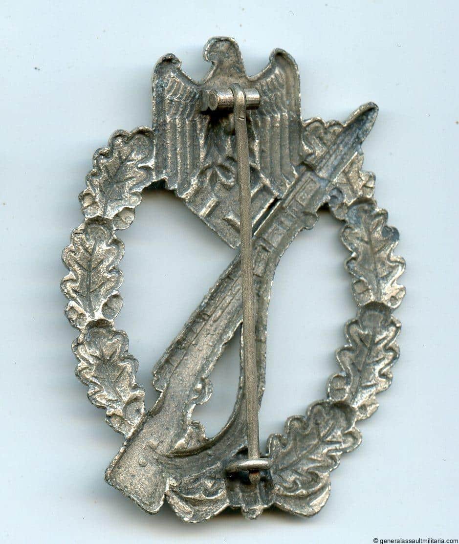 Infantry assault badge in silver – Friedrich Linden, Lüdenscheid. Hollow zinc construction with small block hinge setup and directly soldered catch. Remains in very good unworn condition with nearly all of the silver plating present and some zink bubbling showing throughout the front. Well preserved FLL, most of the time found without much of the finish showing.