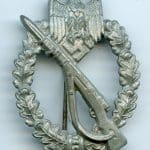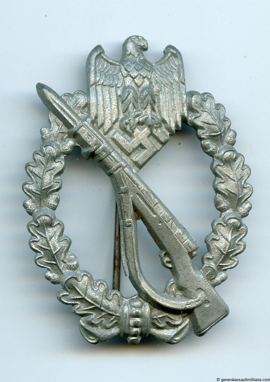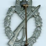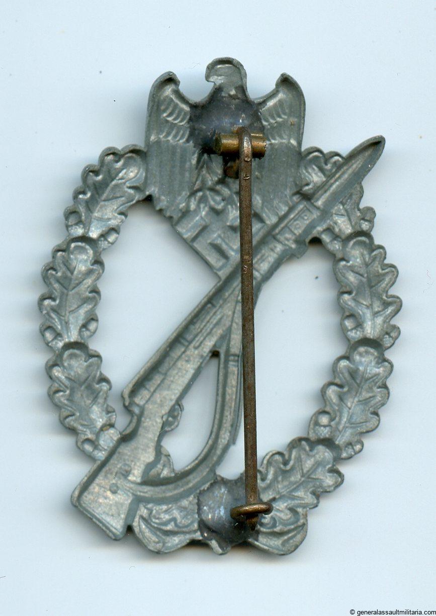 Infantry assault badge in silver – Friedrich Linden, Lüdenscheid. Hollow zinc IAB with directly soldered setup and FLL design. Remains in lightly worn condition and still has most of the finish remaining on the front and back. Good looking example with slight factory curve and well detailed design.