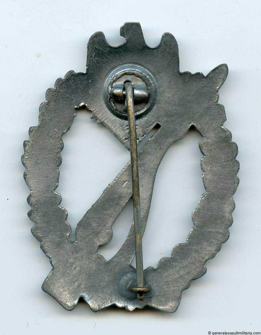 Infantry assault badge in silver – Hermann Aurich, Dresden. Mid to late war solid zinc IAB with crimped in setup and Aurich makers mark. Remains in very good lightly worn condition with most of the ‘Glanzverzinkt’ finish still present on both sides. Sharp design with great details. More uncommon IAB.