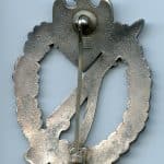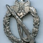 Infantry assault badge in silver – Josef Felix & Söhne, Gablonz. Mid to late war zinc IAB with crimped Gablonz style setup. Remains in lightly worn condition with still good bright silver plating remaining. Quality IAB with vaulted appearance and JFS makers mark on the back.