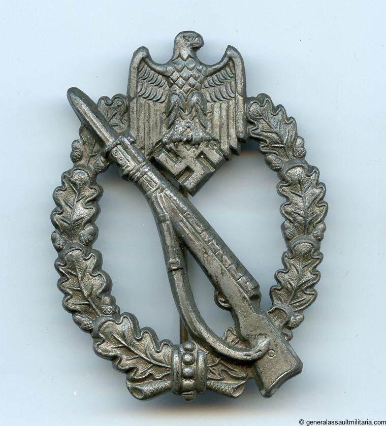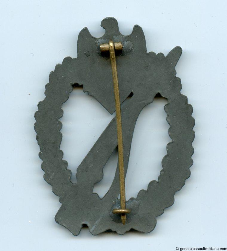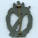 Infantry assault badge in bronze – Karl Wurster, Markneukirchen. Heavy zinc construction and dark tone bronze finish. Typical sloppy soldering on the catch and hinge. The badge is marked with the small W logo from Wurster and remains in nicely worn condition with a faded bronze finish. Zinc Wurster IAB are rarer than the solid tombac pieces, one of the most difficult to find zinc IAB. No damage or repairs.