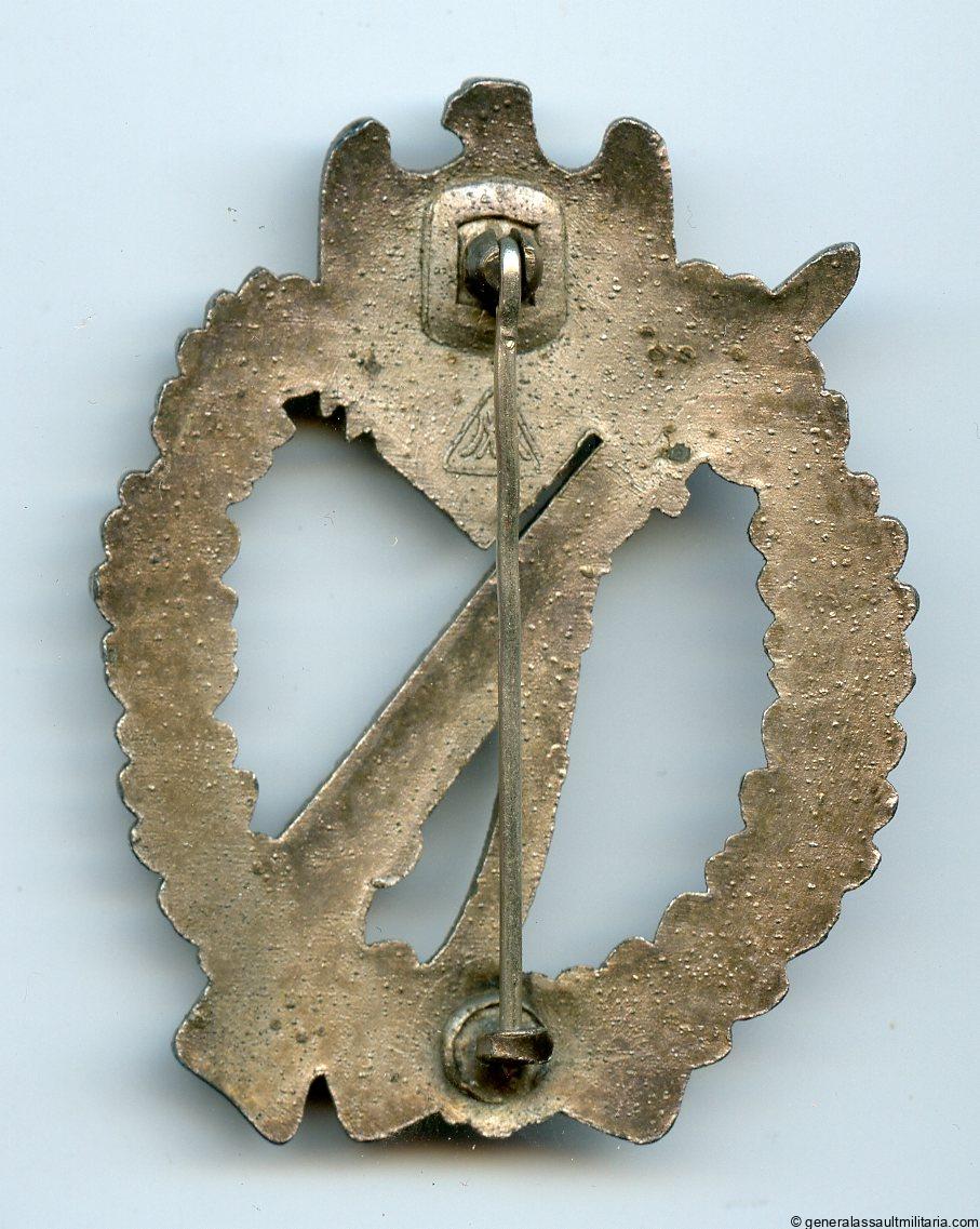 Infantry assault badge in silver – Metall & Kunststoff, Gablonz. Mid to late war solid zinc IAB with thick silver plated finish, MK in trinalge mark and Gablonz style crimped setup. Remains in excellent lightly worn condition with nearly perfect silver plating remaining. Just great qualitly IABs overall.