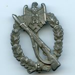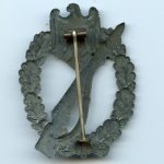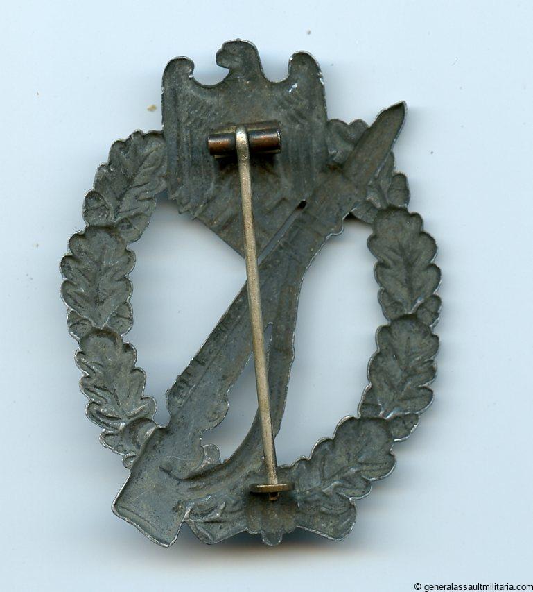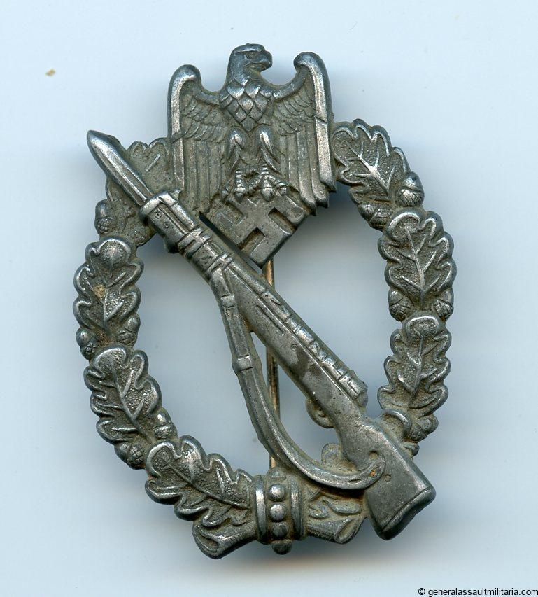 Infantry assault badge in silver – Otto Schickle, Pforzheim. Hollow zink general assault badge with typical Schickle Setup, the silver finish has turned gray/dark as is nearly always the case with this type of finish. The badge shows signs of proper wear and is free of damage or repairs.