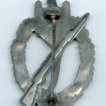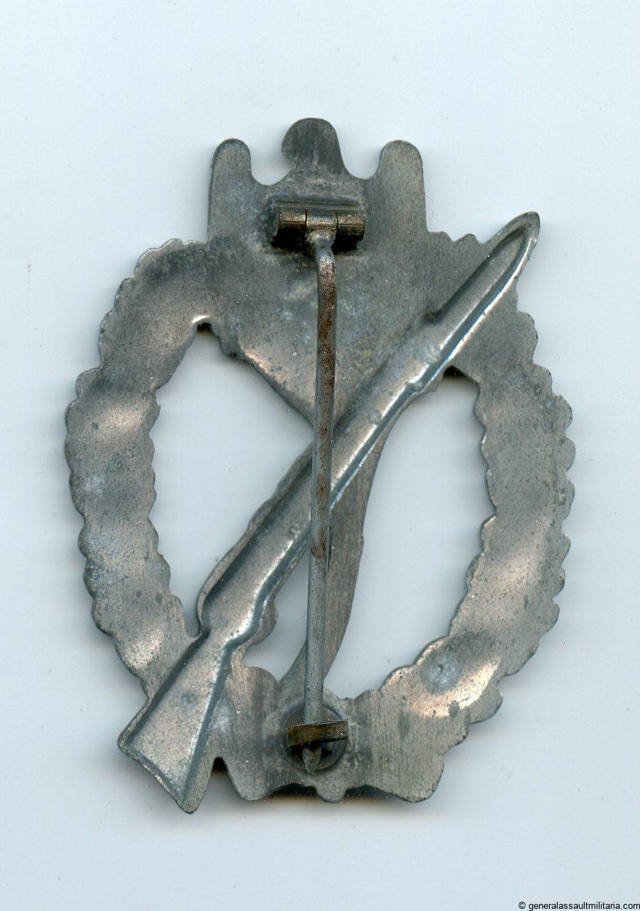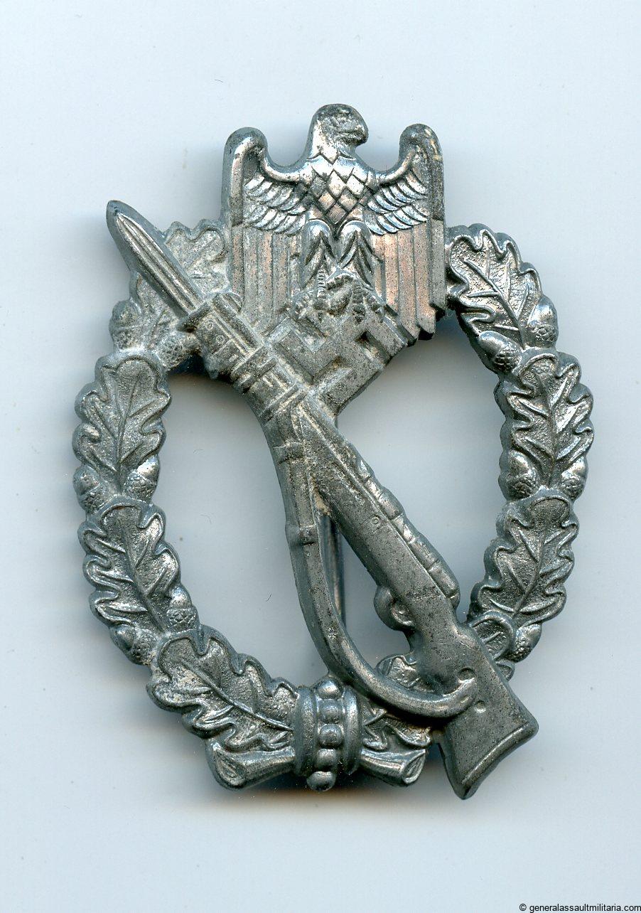 Infantry assault badge in silver – Paul Meybauer, Berlin. Vienna design semi-hollow zinc badge in lightly worn condition with ‘Glanzverzinkt’ finish type. Has retained most of the finish and the zinc only shows light surface oxidation on some parts of the badge. Very uncommon and sought after IAB variant in good condition.