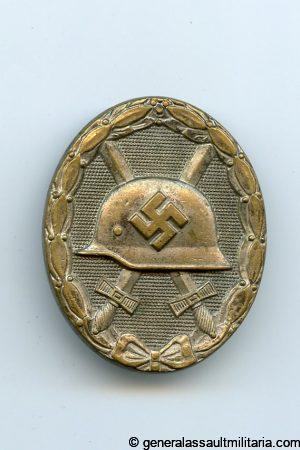 Infantry assault badge in silver – Sohni Hubach und Co, lilypad setup. Semi hollow zink contruction with the difficult to find lilypad setup, 5 vine Schuco design in worn condition. The badge remains in nicely worn condition with clear signs of wear. The finish has turned dark over time as is often the case with this type of silver finish. Textbook Lilypad Schuco without damage or repair. Slightly bend inwards.