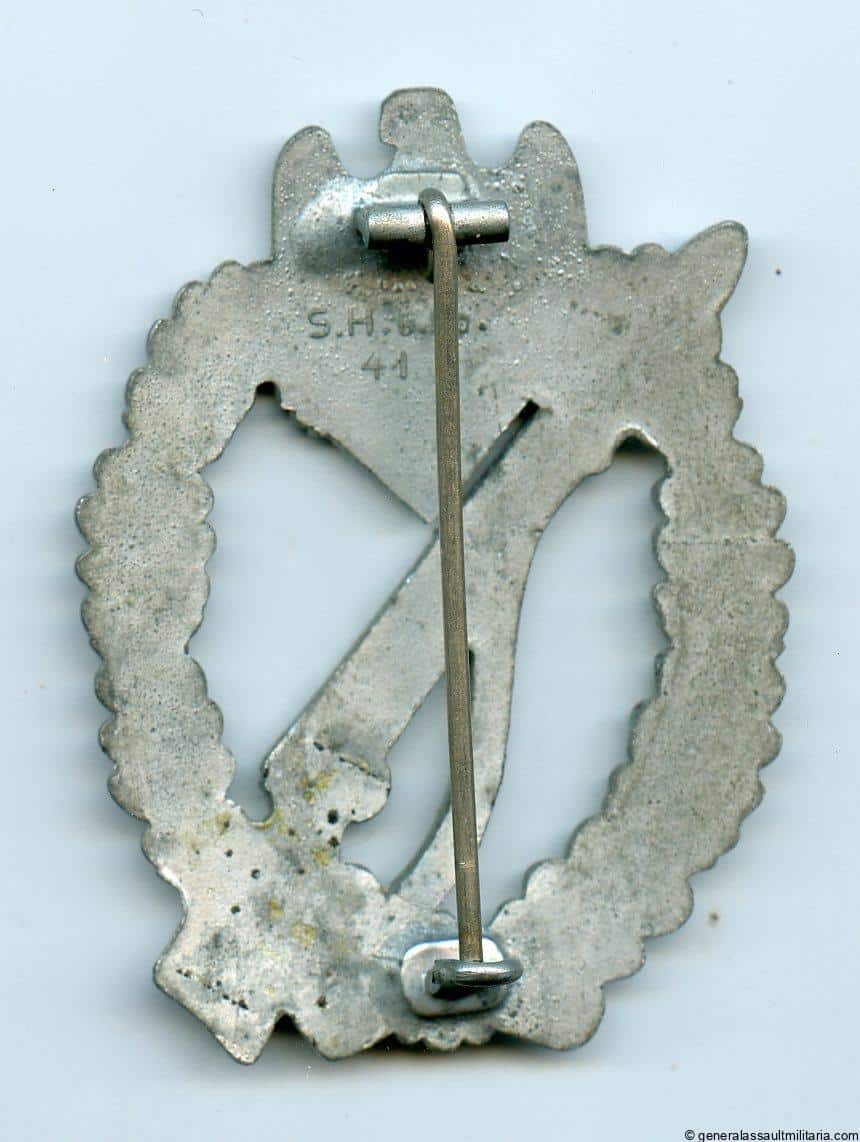 Infantry assault badge in silver – Sohni Heubach & Co, Idar Oberstein. Mid to late war heavy solid zinc IAB with SHuCo makers mark and bright silver finish with factory polished front. Remains in excellent condition and retained 100% of the original finish without any patina or fading on the front. Top quality IAB with a sharp design(4-Vein SHuCo design).
