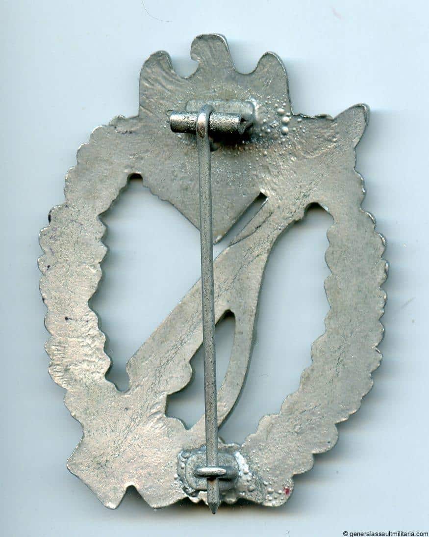 Infantry assault badge in silver – Sohni Heubach & Co, Idar Oberstein. Mid to late war solid zinc ‘Infanterie-Sturmabzeichen’ with SHuCo 5-vein design and makers mark under the hinge. Remains in perfect mint and unworn condition with all of the ‘Glanzverzinkt’ finish remaining, with a great sharp look to it. Makers mark was up quite high and has the hinge soldered onto it, which was no uncommon with these. For sure one of the best quality and most detailed designs out there.