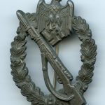 Infantry assault badge in silver – Sohni Heubach und Co, Idar-Oberstein. Zinc IAB with faded silver wash finish. The badge remains in worn condition and only shows the original finish on the setup. Unmarked zinc example but known as the ShuCo design, most likely has a connection to a maker from Idar Oberstein. With for 4 Veins on the 1 O`clock side of the wreath.