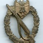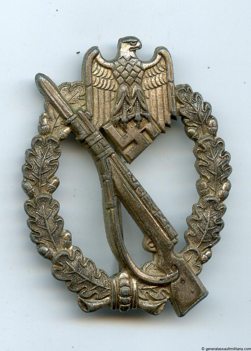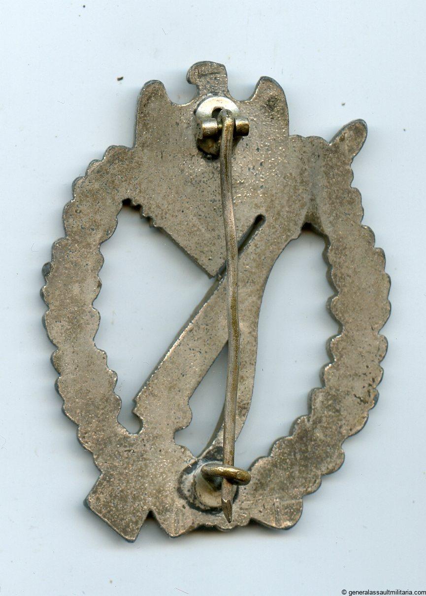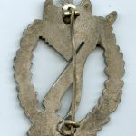 Infantry assault badge in silver – Steinhauer & Lück, Lüdenscheid. Mid war zinc IAB with silver plated finish and oval hinge setup. Remains in worn condition with nearly all the silver plated finish still present. Always unmarked but known product by S&L. Quality finish on this well designed IAB.