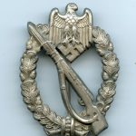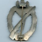 Infantry assault badge in silver – Unknown maker ”H” crimped. Very uncommon late war zinc variant from the unknown maker ”H” with crimped in setup and scooped out K98 rifle. In slightly worn condition with the finish very well preserved. This exact piece is also featured in the GCA database for reference.