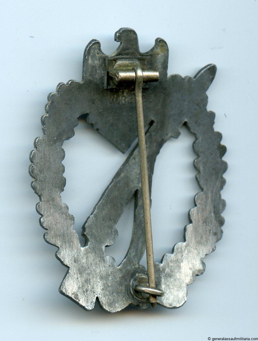 Infantry assault badge in silver – Werner Redo 42, Saarlautern. Mid war IAB with W.R. 42 makers mark and vaulted appearance. Remains in worn condition and has all finish faded but retained a somewhat bright shine. Small oxidation spot on the top left side of the wing, but overall nicely preserved condition. Uncommon and sought after marked variant.