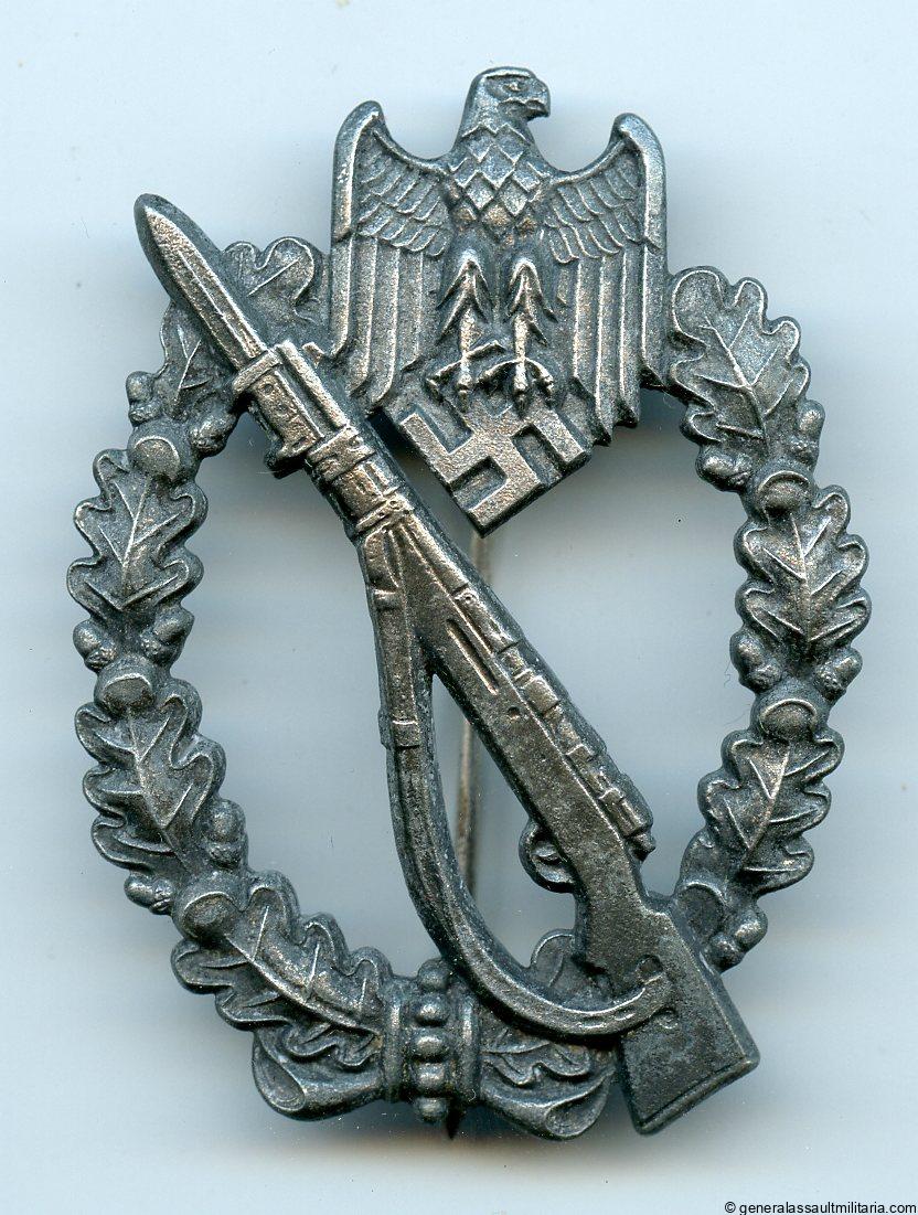 Infantry assault badge in silver – Werner Redo, Saarlautern. Zinc ‘Infantrie sturmabzeichen’ with factory vaulted appearance. The badge remains in unworn condition with all the finish still present, however the finish has partially faded. Finding a W.R. 42 IAB with bright silver wash finish is extremely difficult given that these are among the most difficult to find marked IAB. Marked with the Redo initials under the catch. Superb looking Redo IAB without damage or repairs.