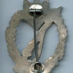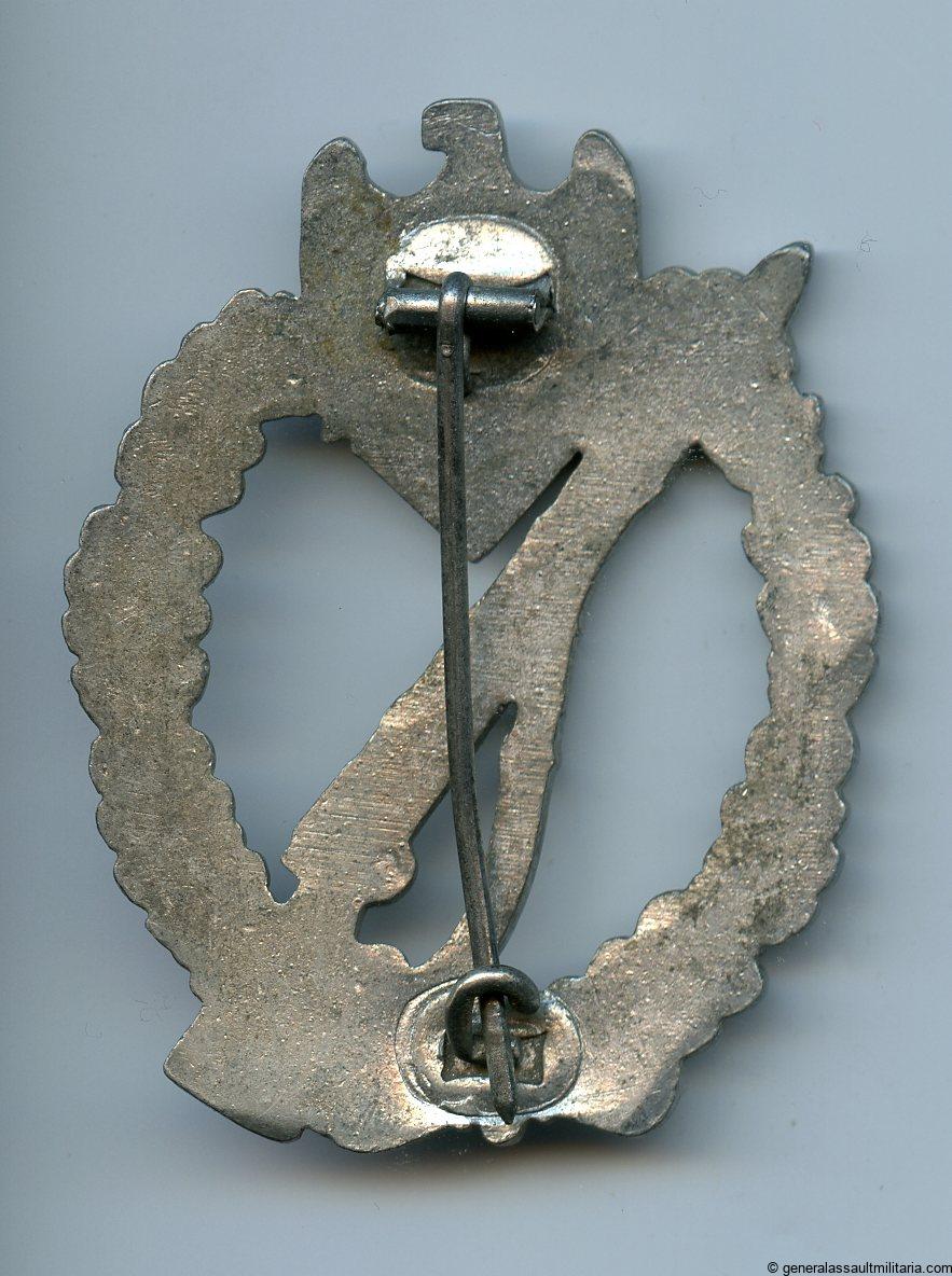 Infantry assault badge in silver – Wilhelem Deumer, Lüdenscheid. Late war zinc Deumer design IAB with oval crimp setup. Remains in worn condition and has nearly all the galvanized finish remaining. These Deumers stay well preserved over time and have a thick finish. Catch is slightly bend up and closed, keeping the pin place.