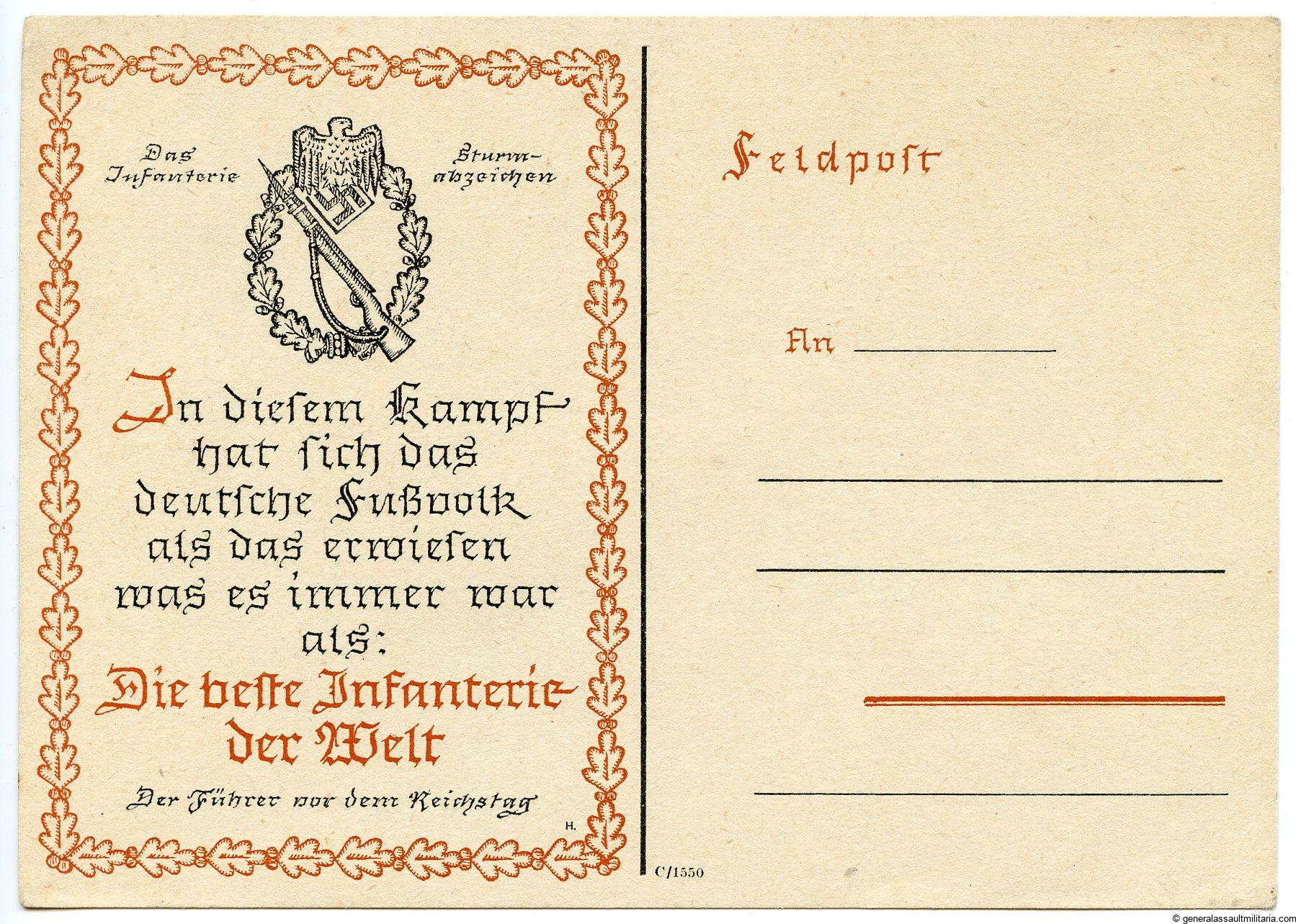 Das Infantry Sturmabzeichen postcard. Unused condition with a good bright look and no staining. Translated to english the card reads: ”In this battle the german people proved what they always have been: The best infantry of the world”.