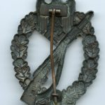 Infantry assault badge – Wilhelm Deumer Lüdenscheid. Hollow zink badge in slightly worn condition. The badge has almost all off its bronze finish remaining and has no damage or repairs. A very difficult to find Infantry assault badge in bronze.