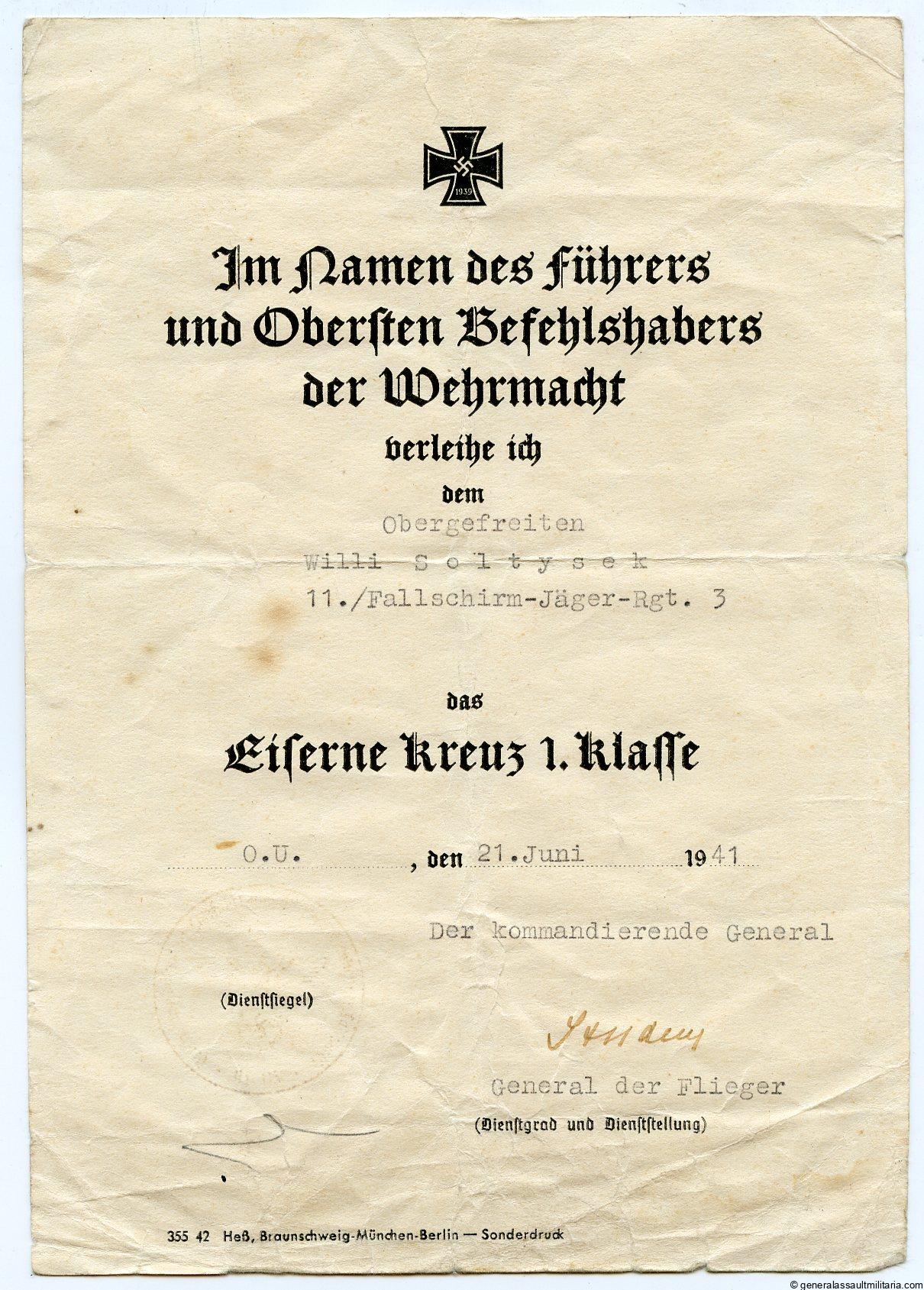 Iron cross 1st class award certificate – FJ Rgt 3. Sonderdruck Iron cross document for Obergefreiten Willi Soltysek 11./Fallschirm-Jäger-Rgt. 3 awarded on 21.06.1941 for action during operation Mercur(Crete). It is singed by General der Flieger Kurt Student. Remains in used and vaulted condition with slight fading from sunlight. Rare and sought after document!