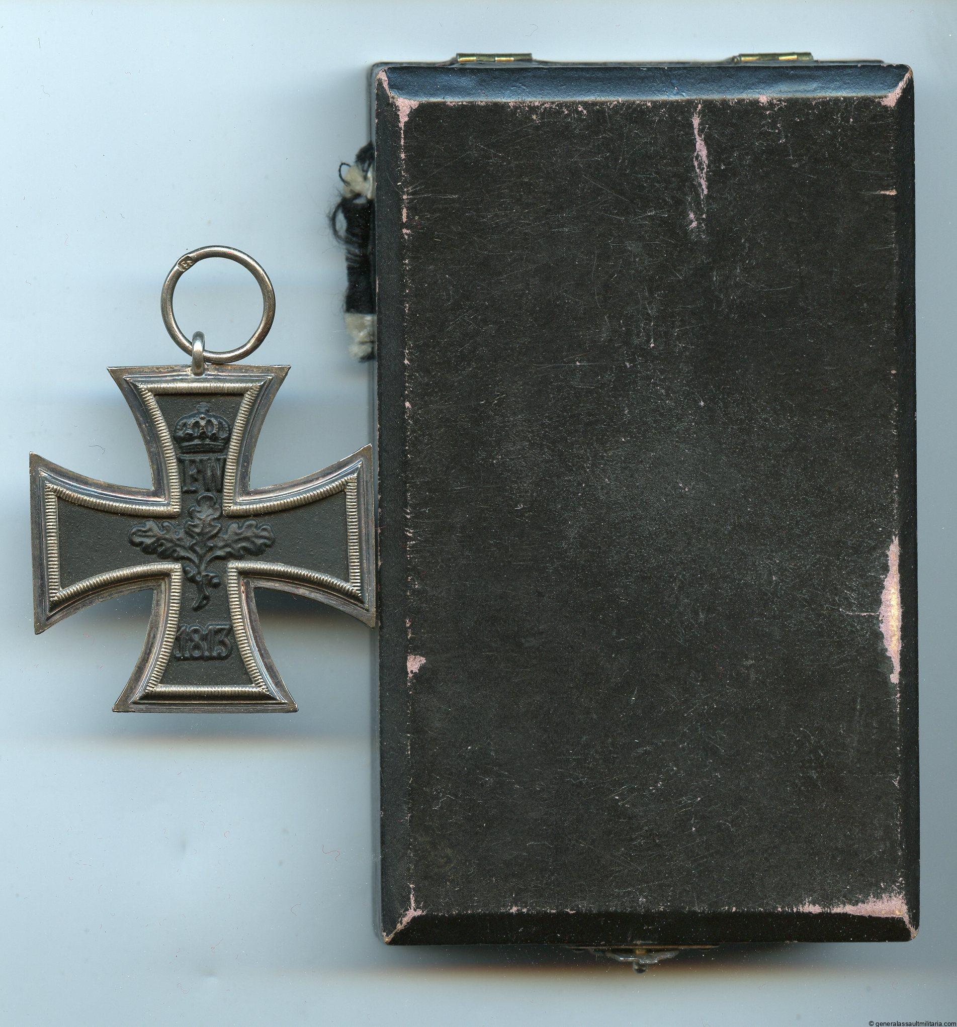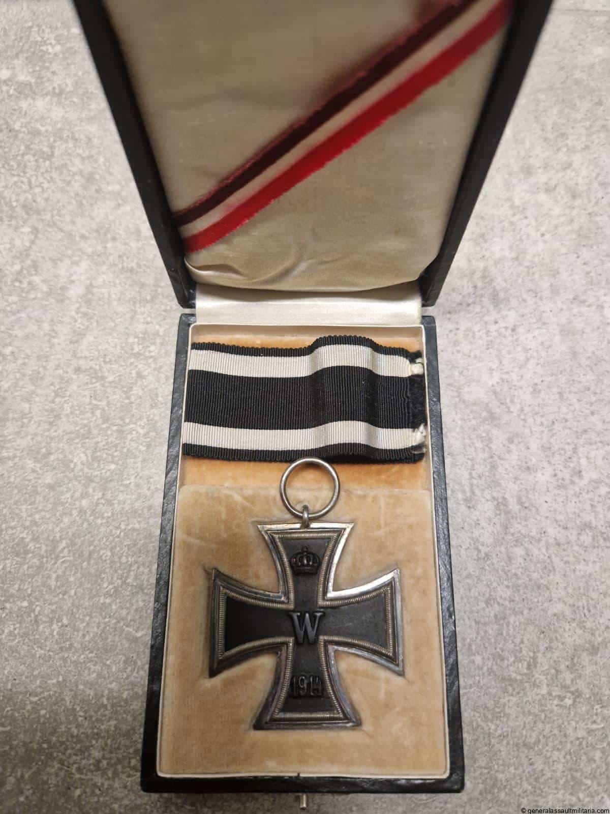Iron cross 2nd class 1914 cased – F. marked. Excellent mint three piece construction cross with mint core and perfectly patinated silver frame. Maker marked F. in the ring. Comes with a private purchased case in equally fine condition, minimal wear to the outside. Very uncommon cased 1914 Ek2.