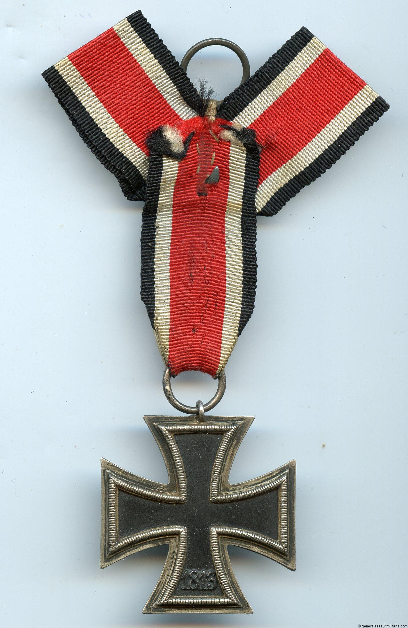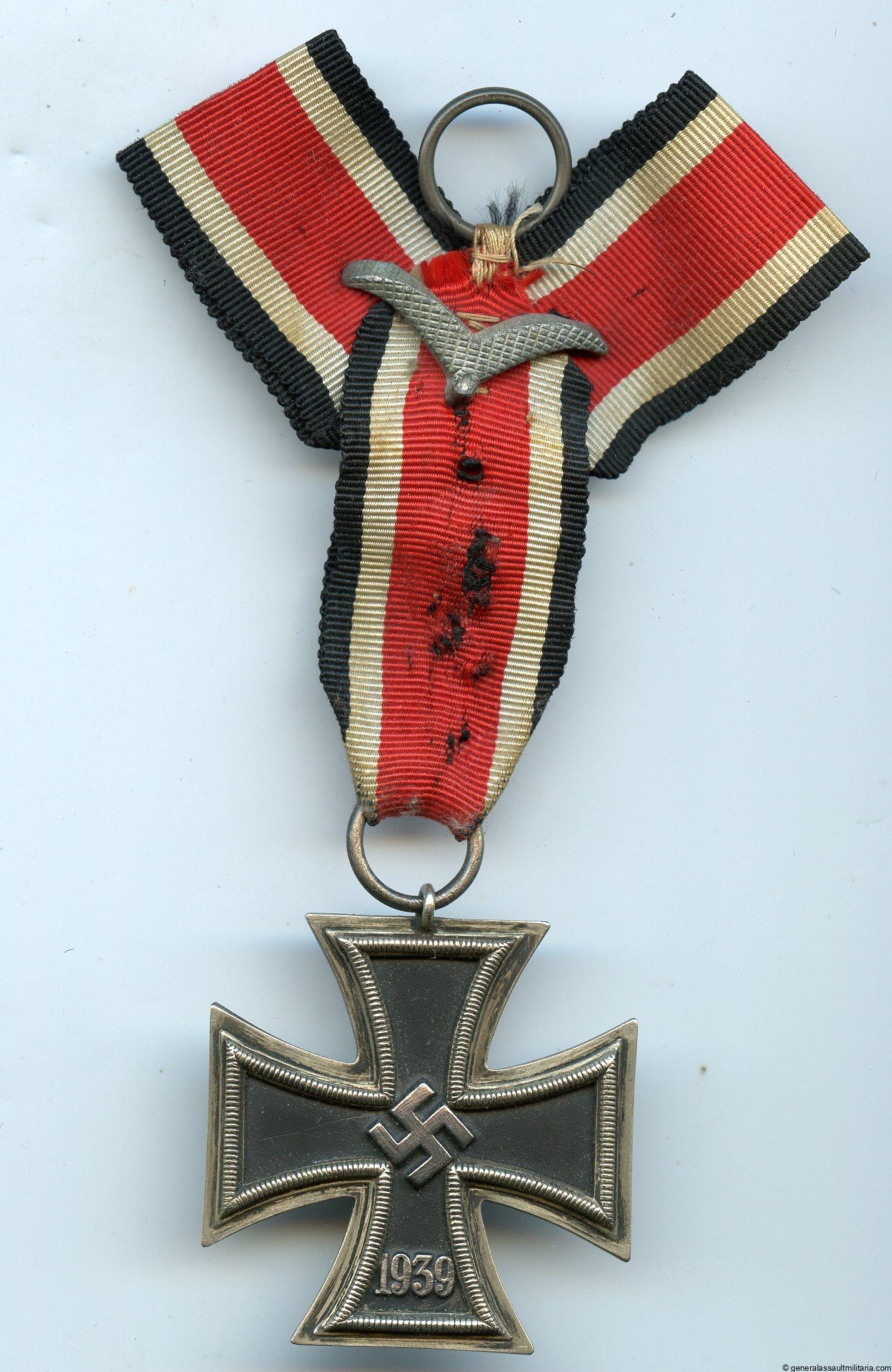 Iron cross 2nd class – MM55 J.E. Hammer & Söhne, Geringswalde. Three piece construction cross with PkZ mark 55 in the ring and a “worn” appearance. Interesting configuration for the ribbon with Luftwaffe rank attachment. Probably displayed in a frame by the soldier or his family in the past.
