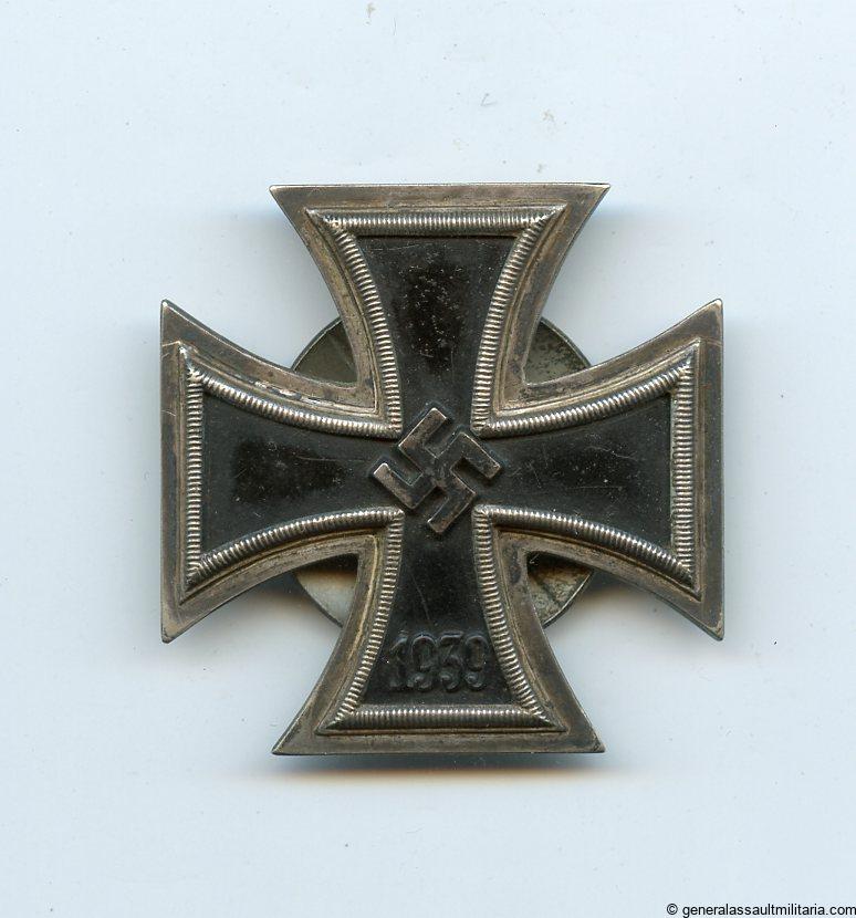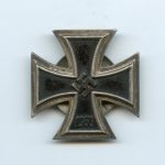 Iron cross first class MM L/55 – Wächtler & Lange, Mittweida. Three piece construction Ek1 with magnetic core. Remains in well worn condition with some of the black paint worn down on the swastika. Good quality cross with faulted appearance. Maker marked on the bottom with the W&L LDO logo.