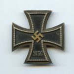 Iron cross first class – Otto Schickle, Pforzheim. Early Schickle Cross with brass core and silvered frame. Well worn cross with slightly vaulted appearance and good patina on the frame. Sought after and uncommon Schickle variant, beautiful look on this worn piece.