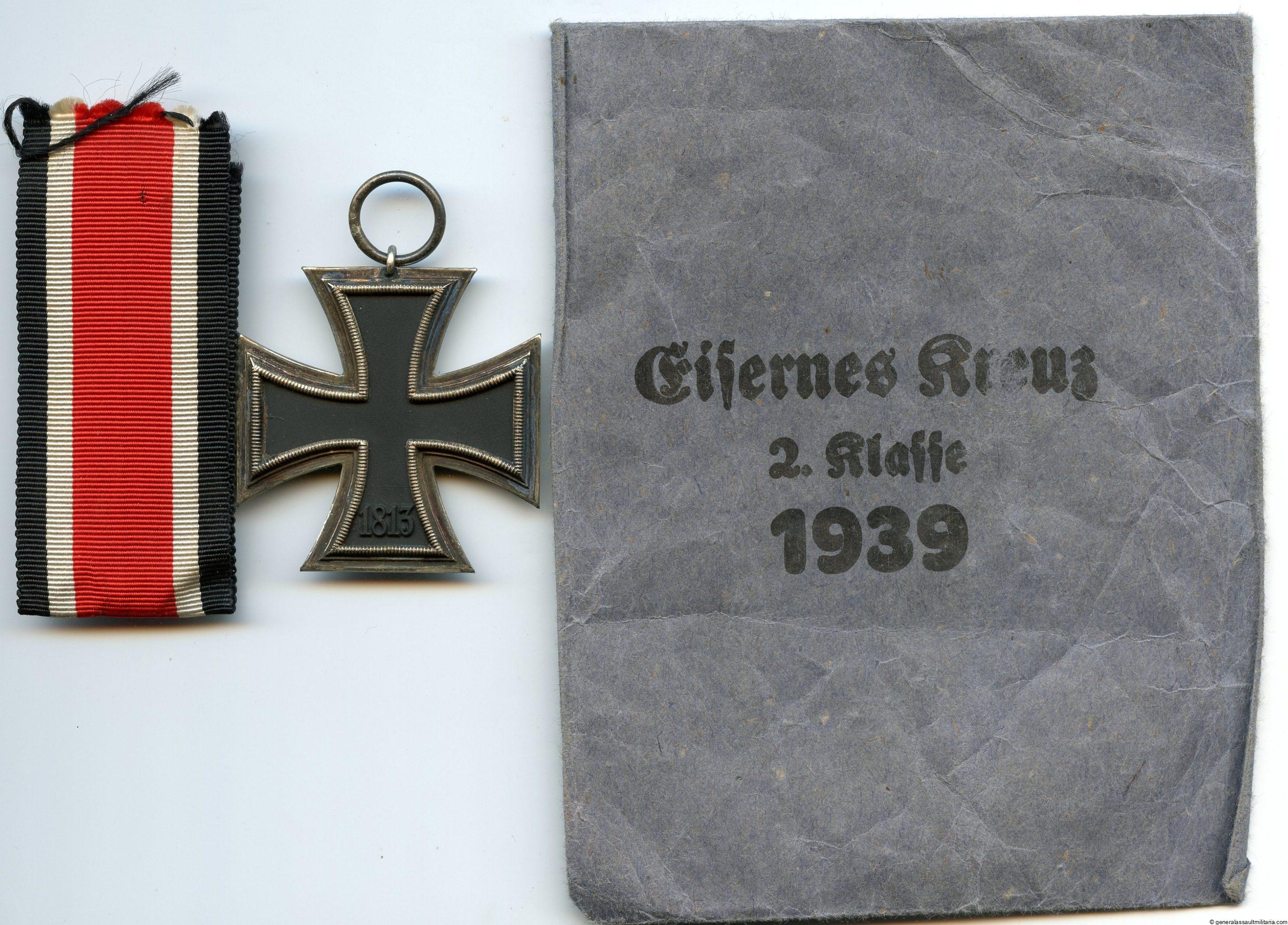 Iron cross second class + packet – L.C. Lauer, Nürnberg-Berlin. Unmarked Lauer three piece construction cross. Remains in very good condition with a dark patina on the frame and a still perfectly black core. Comes with matching packet in good condition and only light wear.