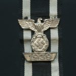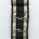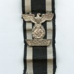 Iron cross second class repeat clasp – C.E. Juncker, Berlin. Mid to late war second pattern ek2 Wiederholungsspange with silver plated finish. remains in lightly worn condition and it still attached to the ribbon with its originally soldered prongs. The cross appears to be unmarked(I did not want to cut the ribbon). Very uncommon Ek2 repeat clasp in very nicely preserved condition. Premium zinc spange.