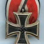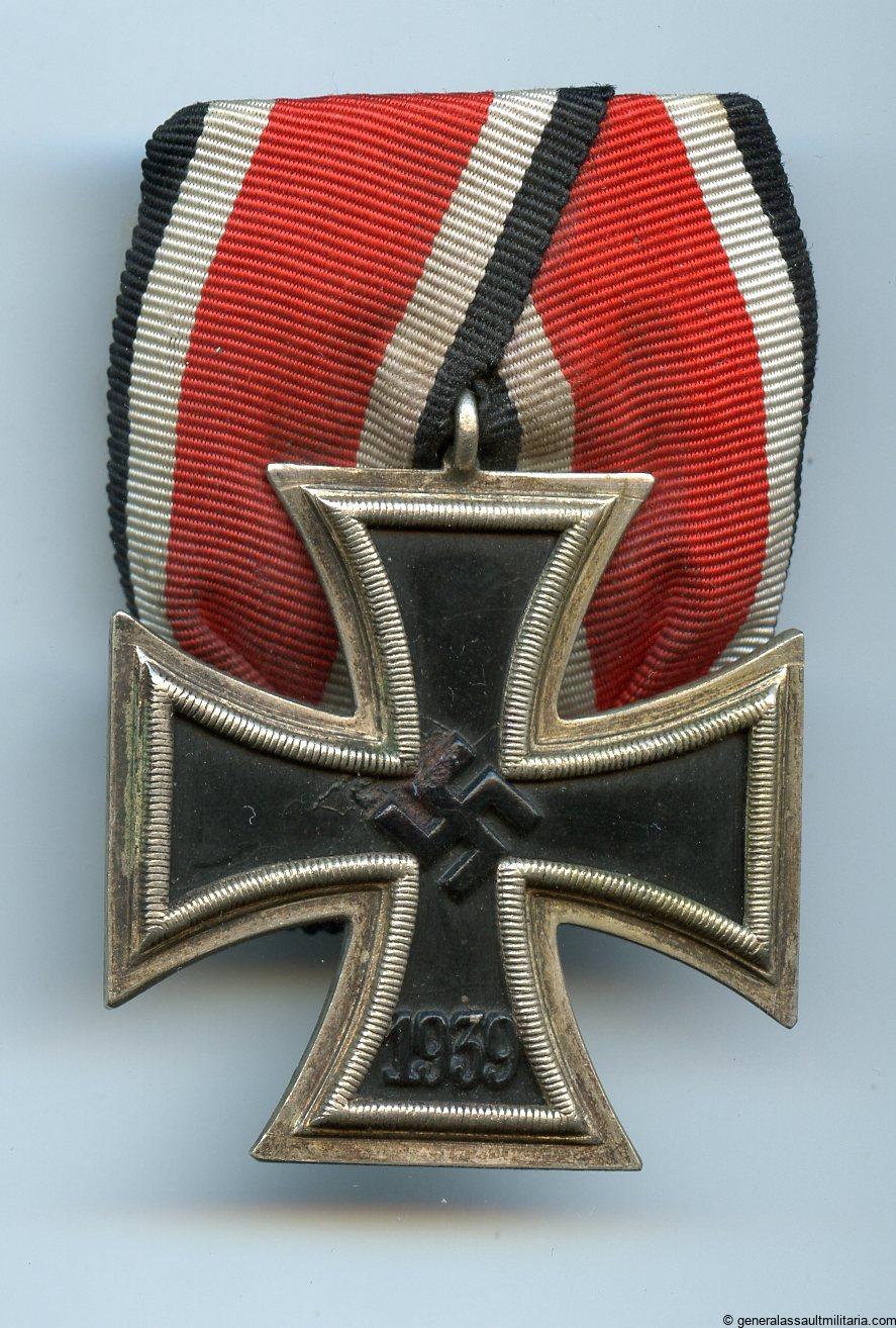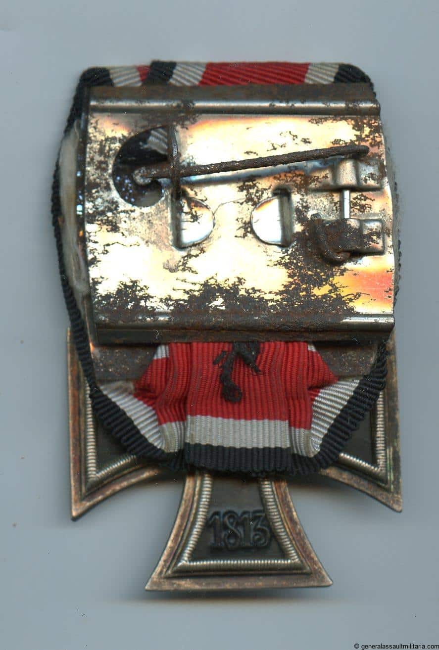 Iron cross second class single mounted – MM2 C.E. Juncker, Berlin. Three piece construction ek2 with Juncker design and Z/2 makers mark in the ring. Remains in good condition with perfect black finish on the back and a small chip on the front. Shows a small dark rust spot on the top swastika arm as well. Very uncommon Juncker product with a PkZ 2 mark in the ring.