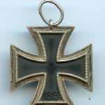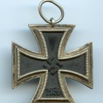 Iron cross second class – UM 25 Arbeitsgemeinschaft, Hanau. Unmarked three piece construction cross with thick and wide frame. The mat black core shows some loss of paint and a lightly pitted swastika surface. Patina on the frame is untouched and the ring is slightly deformed. Average looking cross that wasn`t treated all to well and would like a new home.