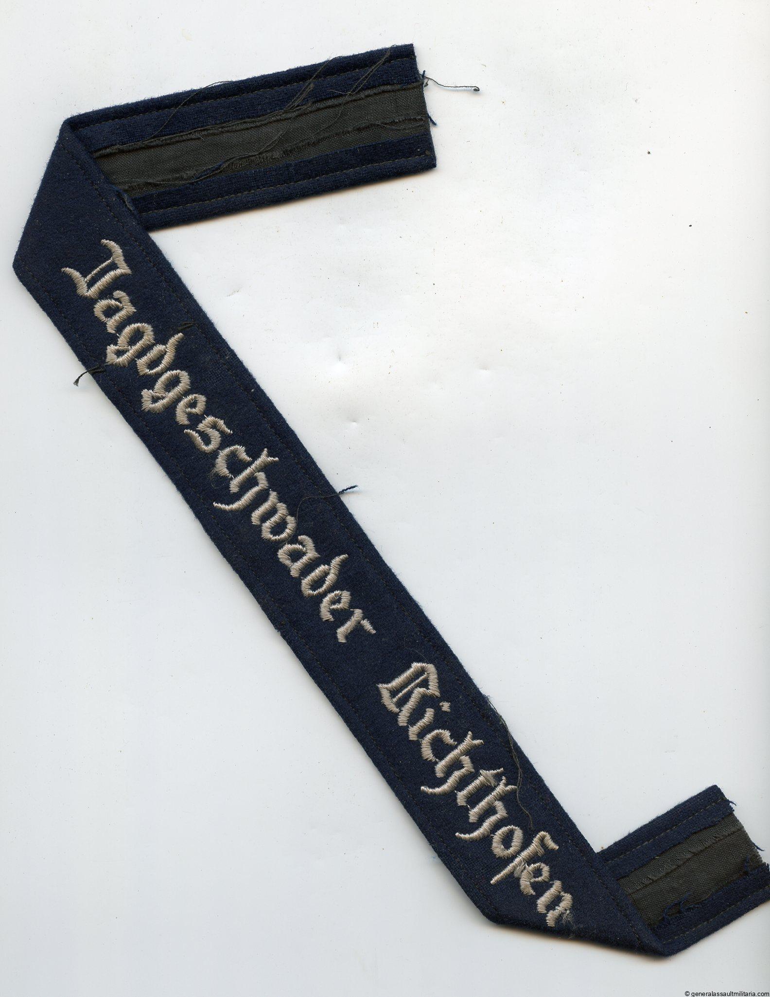 Jagdgeschwader Richthofen cufftitle. Uniform removed blue wool construction with woven ‘Jagdgeschwader Richthofen’ script and black backing cloth. Remains in very nice worn condition with clear signs of being uniform removed. Very appealing example with just the right wear to it!