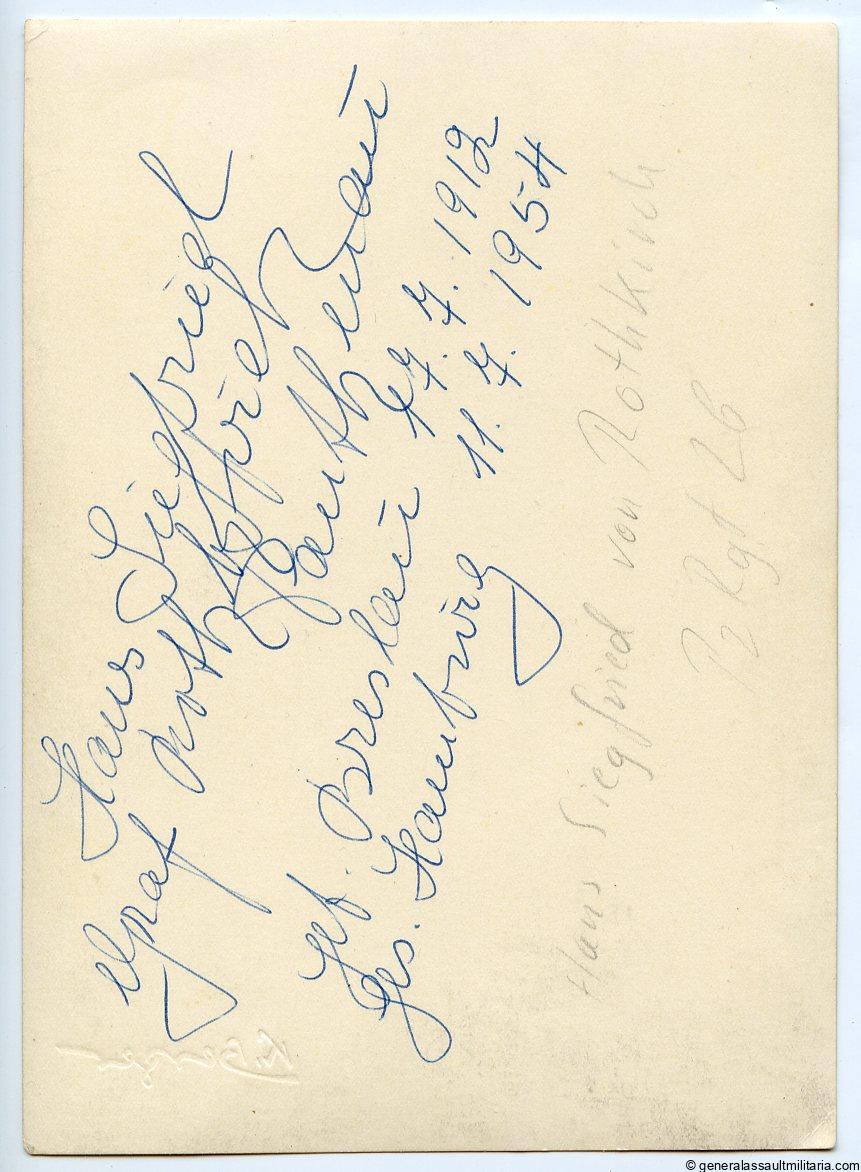 Knights cross holder potrait Hans-Siegfried Graf von Rothkirch. Slightly larger then postcard size portrait of Graf von Rothkirch with his German cross and Knights cross in wear. von Rothkirch was awarded the ‘Ritterkreuz’ on 4.10.1944 as Kommandeur, I. Abteilung, Panzer-Regiment 26, Panzergrenadier-Division “Großdeutschland”. Remains in excellent condition with minimal wear and impressed atelier stamp int he bottom corner.