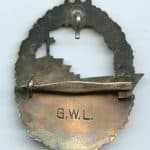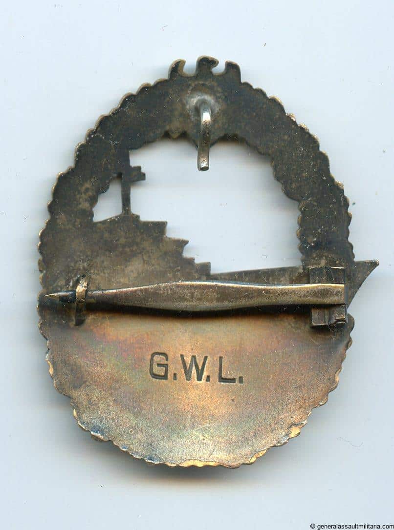 Kriegsmarine destroyer badge – Gebrüder Wegerhoff, Lüdenscheid. Early tombac ‘Zerstörer’ with gold finish wreath and silver plated ship. Remains in cleaned condition and shows little to no gold finish remaining on the wreath. The ship shows most of the finish still present but in patinated condition, meaning cleaning was done very long ago. Some good wear to it and maker marked with the Large G.W.L. logo on the back.