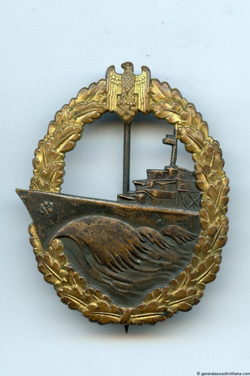 Kriegsmarine destroyer badge – Wilhelm Deumer, Lüdenscheid. Early tombac Zerstörer with gilded wreath and silvered ship. Remains in worn condition and shows ma good part of the gilding still on the wreath. The ship shows a dark silver patina and retained the plating well. Quality early Deumer KM award.
