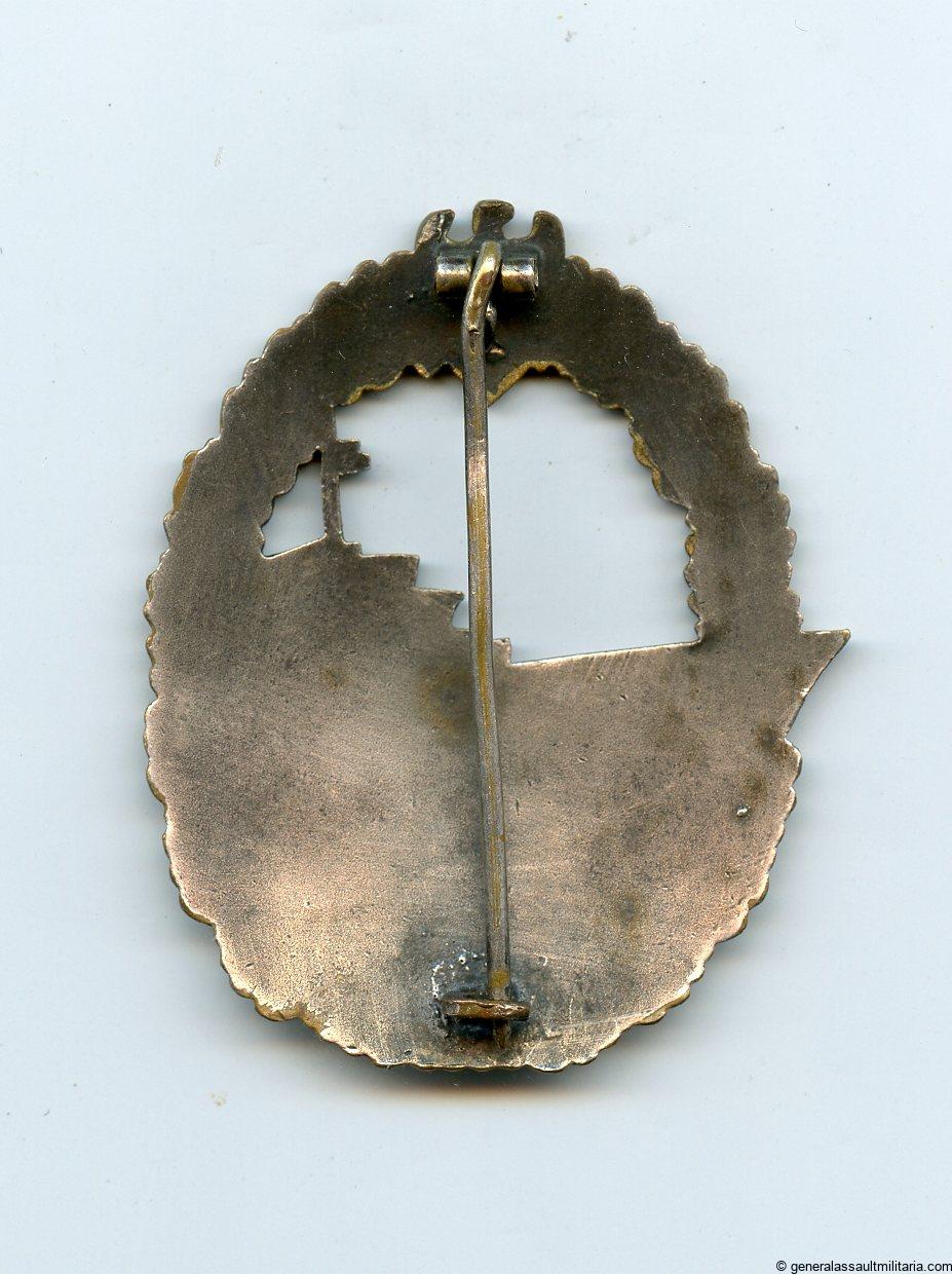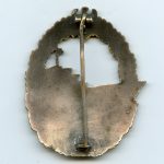 Kriegsmarine Destroyer badge – Wilhelm Deumer, Lüdenscheid. Early tombac ‘Zerstörer’ in nicely worn condition. Good quality badge with vertical Deumer setup. Some of the silver finish on the ship is been worn down, but overall nicely preserved. More uncommon early Deumer Destroyer badge.