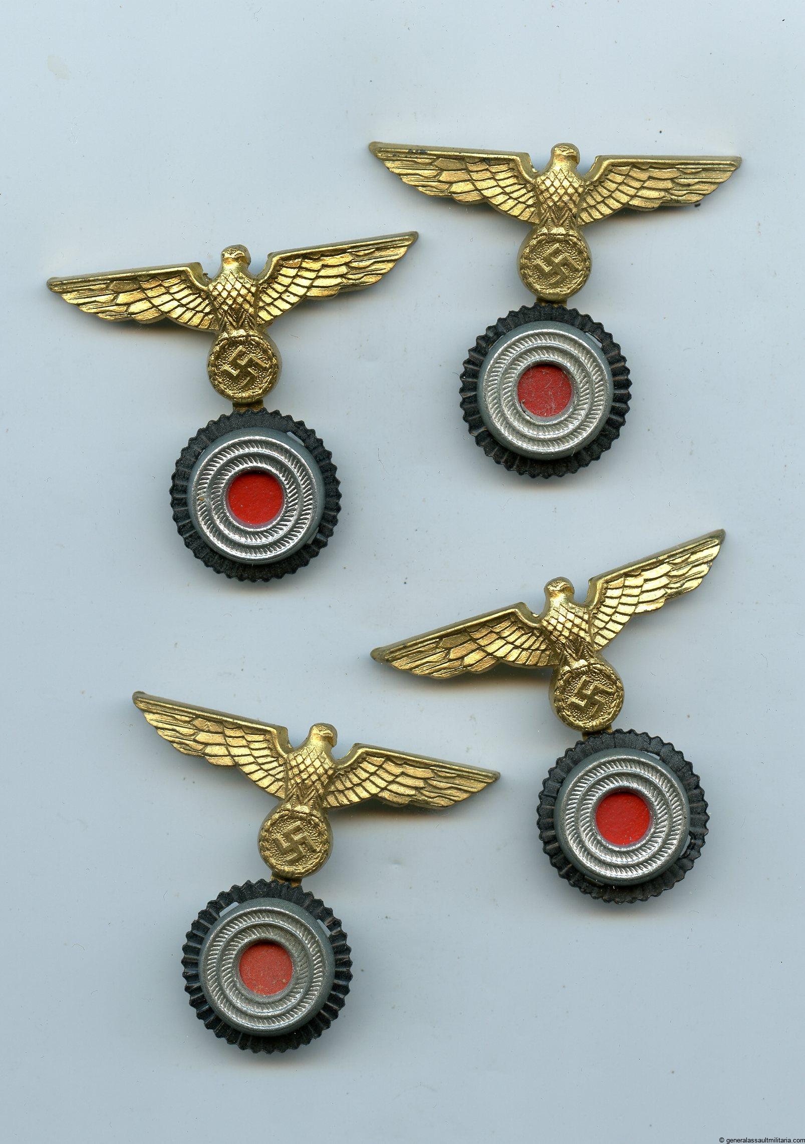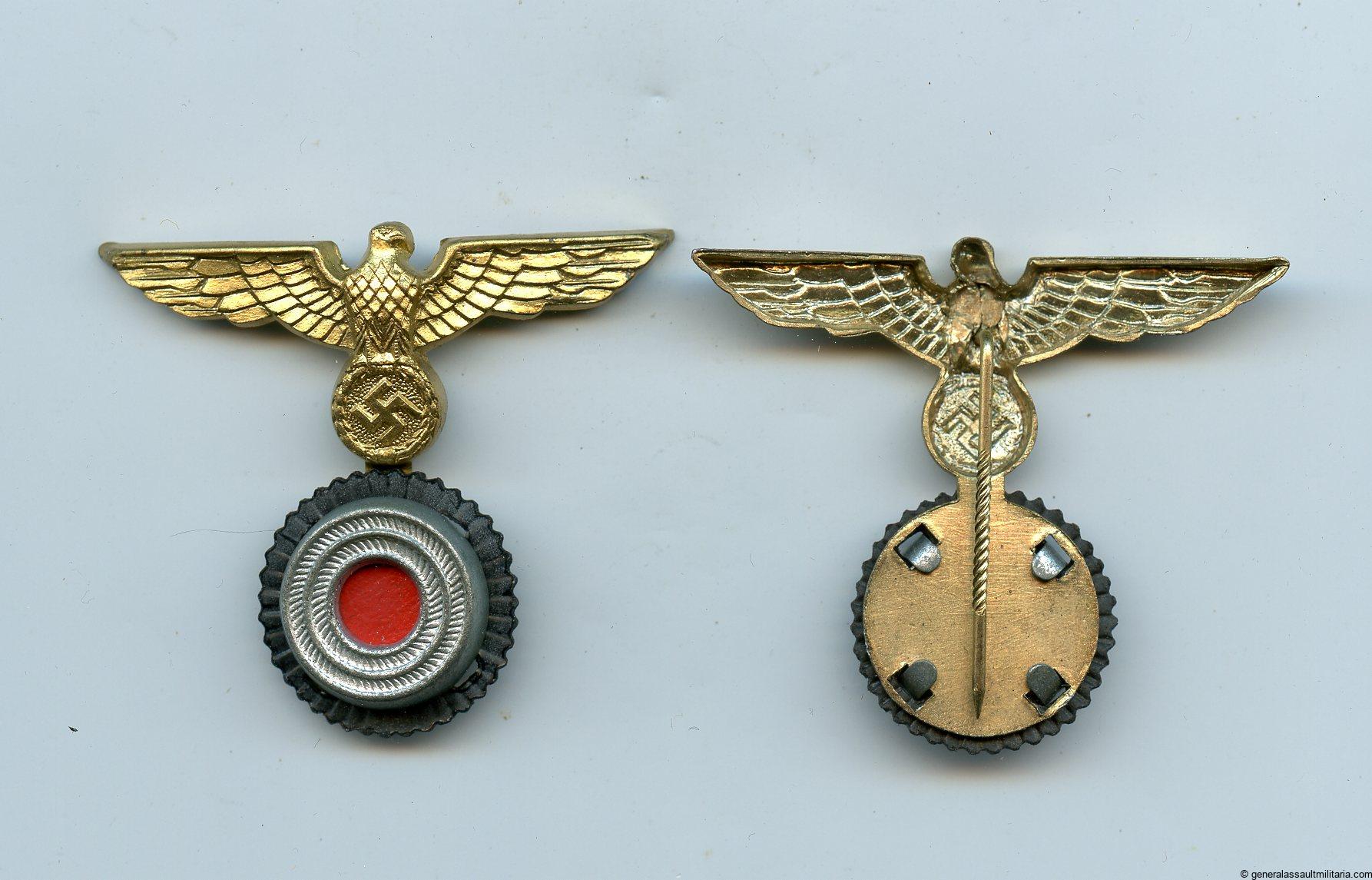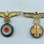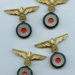 Kriegsmarine NCO cap eagle with attached cockade. Early first pattern aluminum stamped eagle with crimped in pin and clipped on cockade. Remain in mint unworn condition and still have all the gilding on t he eagles. Top example from left over stock.