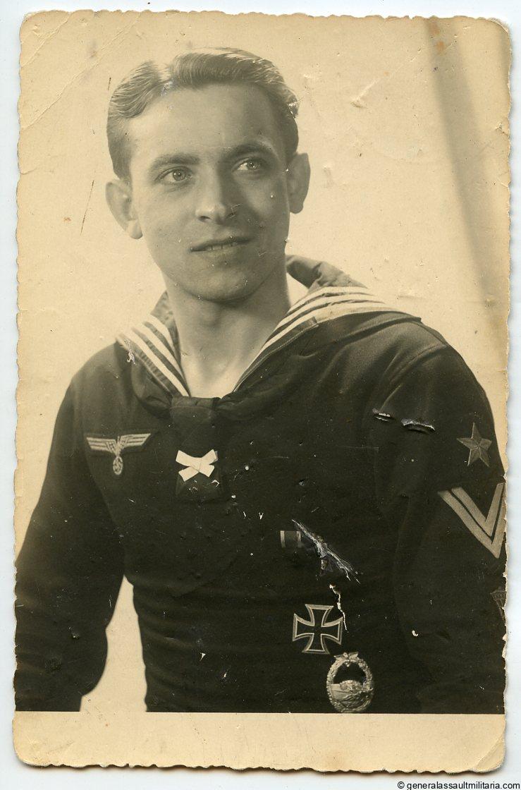 Kriegsmarine S-boat + Ek1 portrait. Very uncommon and high sought after portrait of a Kriegsmarine soldier wearing the S&L Ek1 and Schwerin S-boat 1st pattern. Very sharp portrait with great details, postcard size, Mimosa portrait paper and dated 22.08.1940 on the reverse. Remains in oke condition with some wear and light surface damage. Stunning portrait and very difficult to find, specially in this quality.